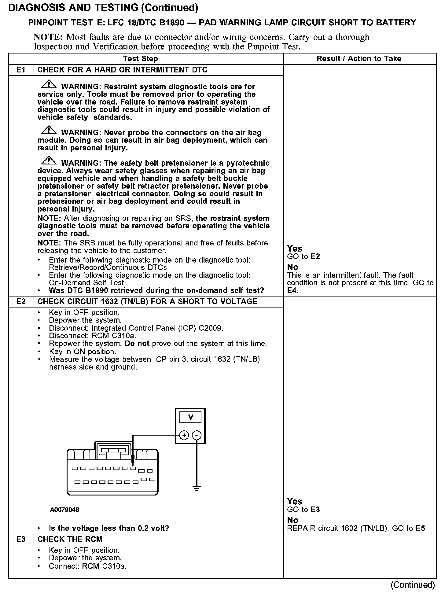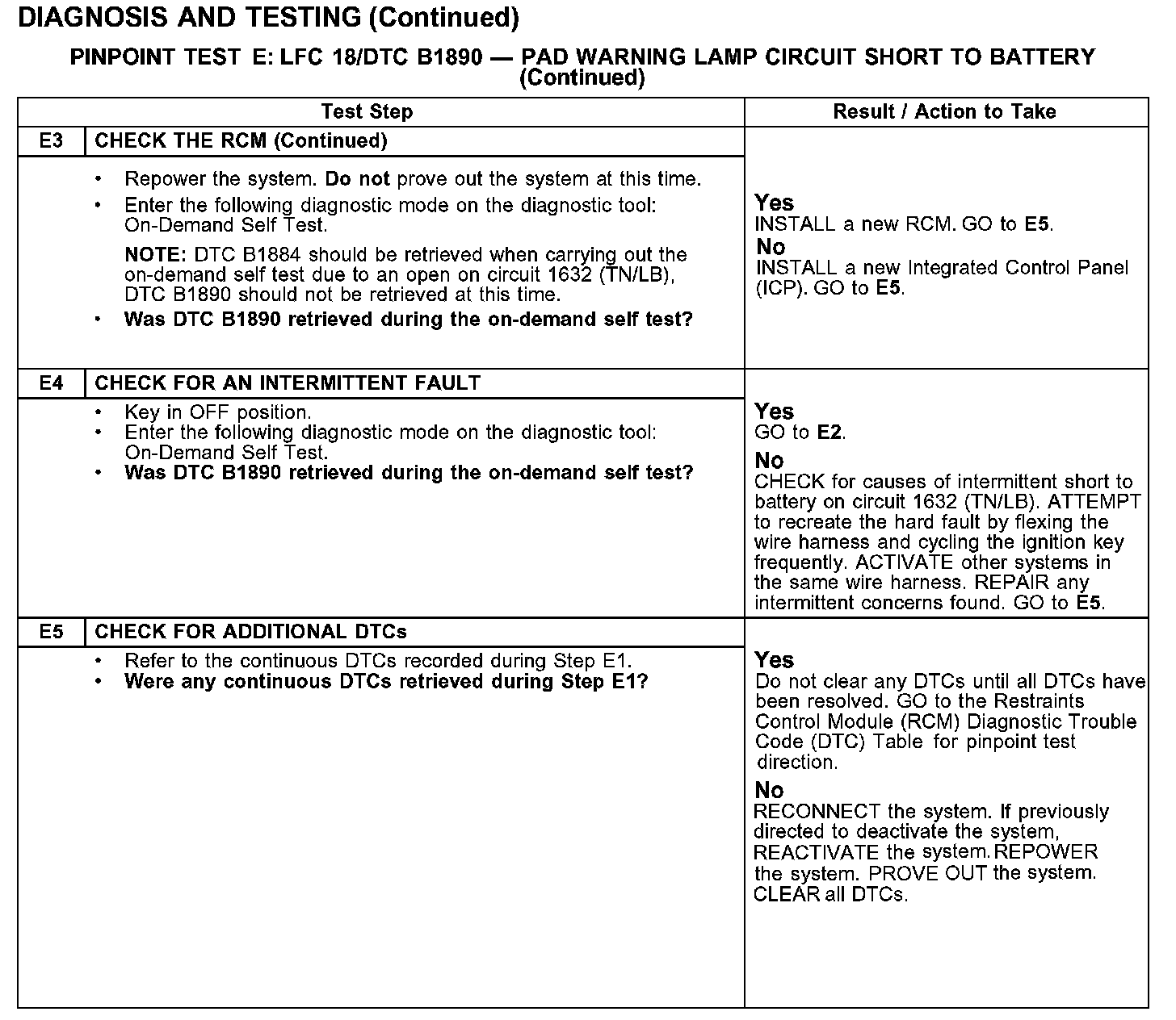 PINPOINT TEST E: LFC18/DTC B1890 - PAD WARNING LAMP CIRCUIT SHORT TO BATTERYTest E1-E3: