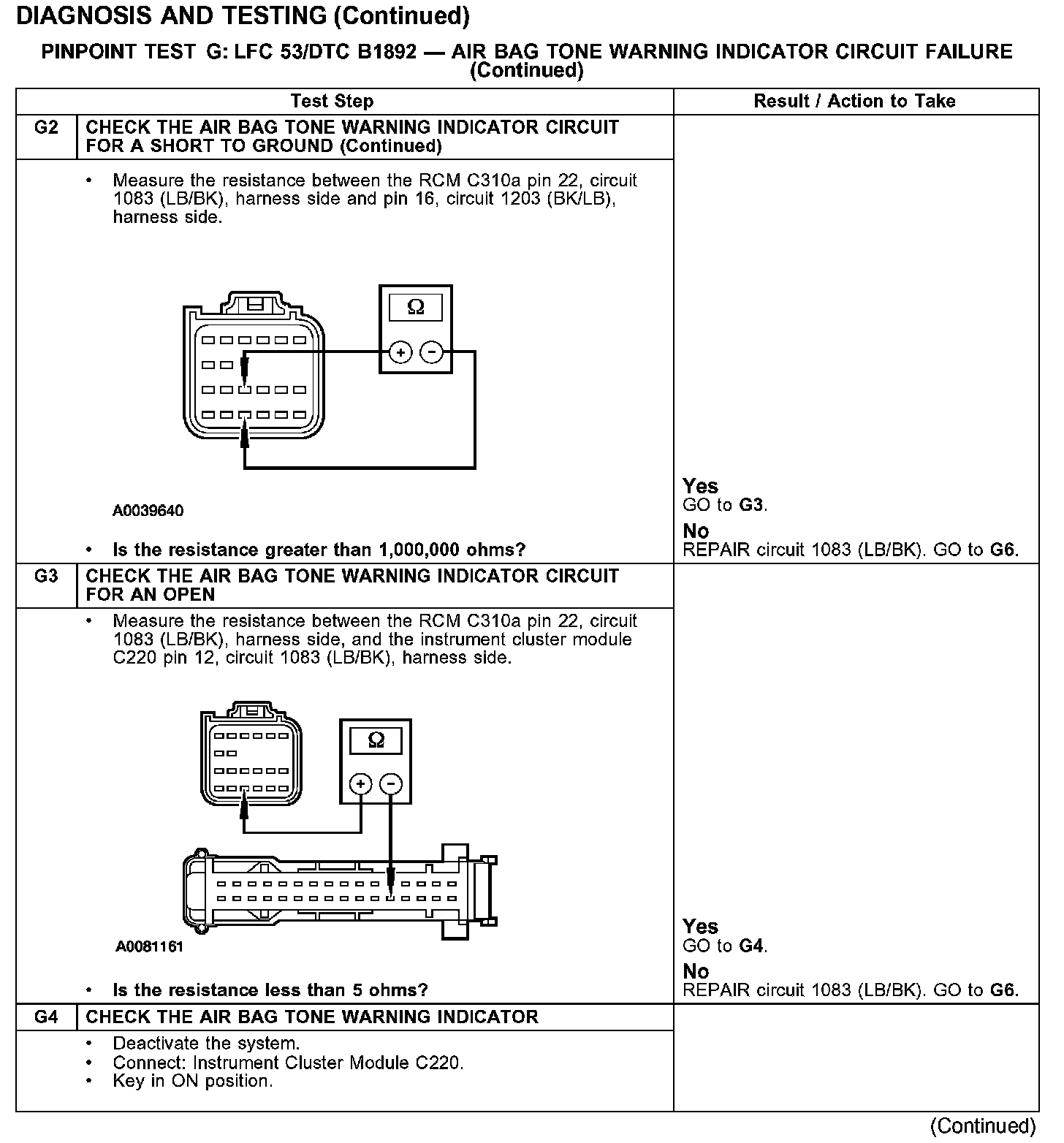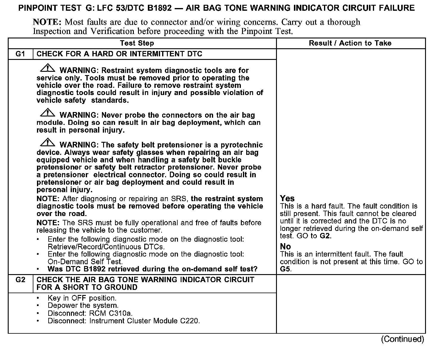 PINPOINT TEST G: LFC 53/DTC B1892 - AIR BAG TONE WARNING INDICATOR CIRCUIT FAILURETest G1-G2: