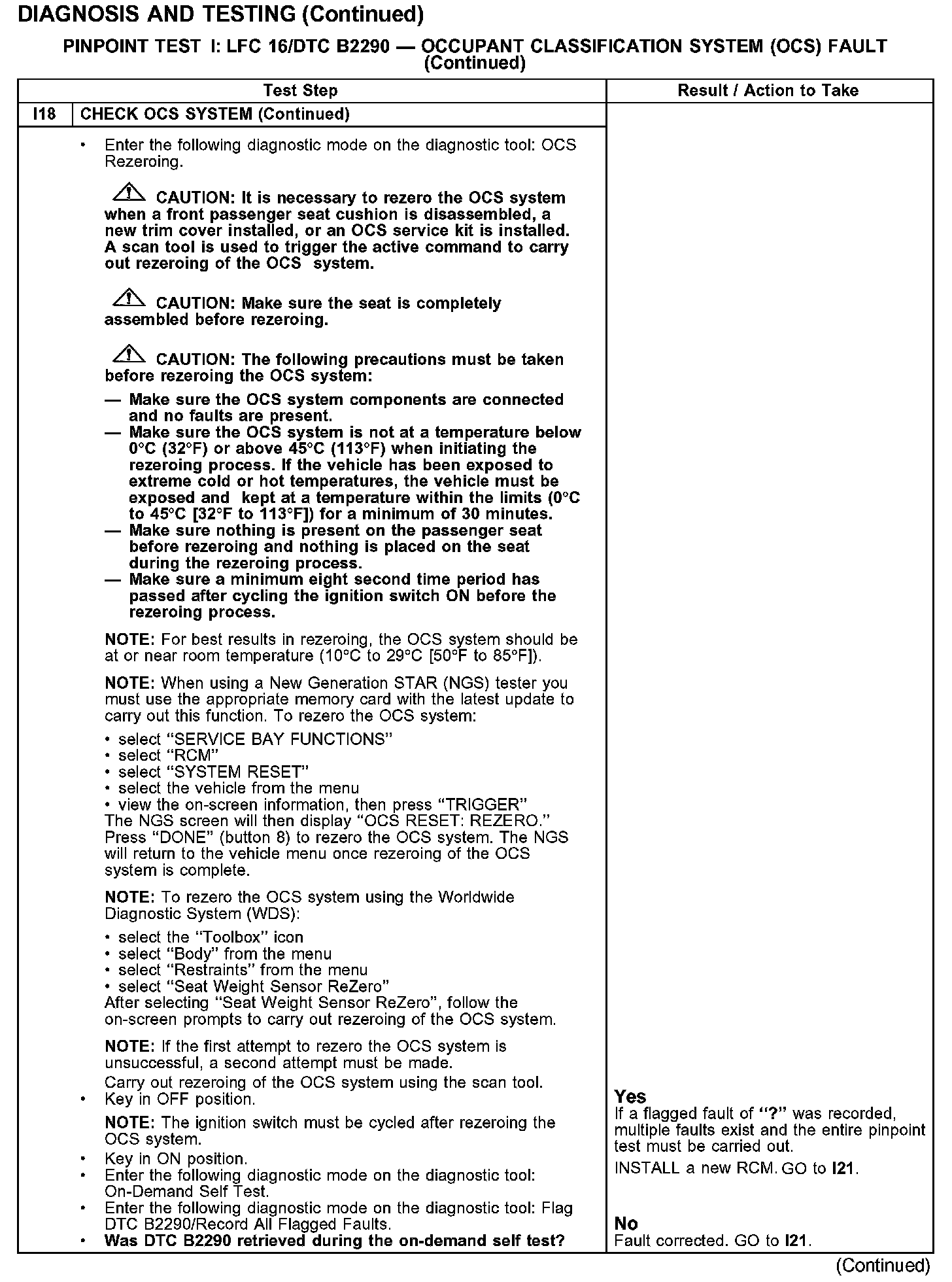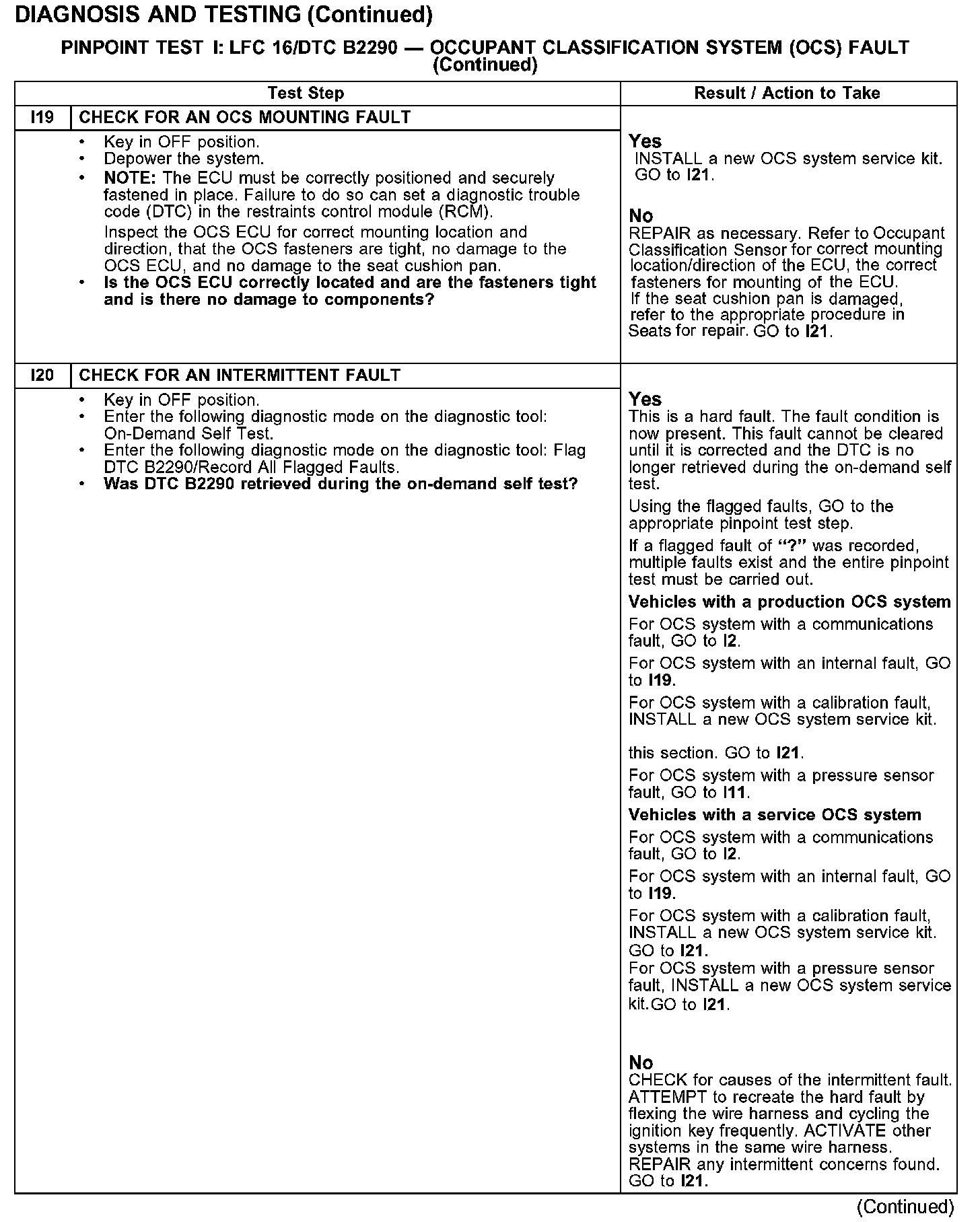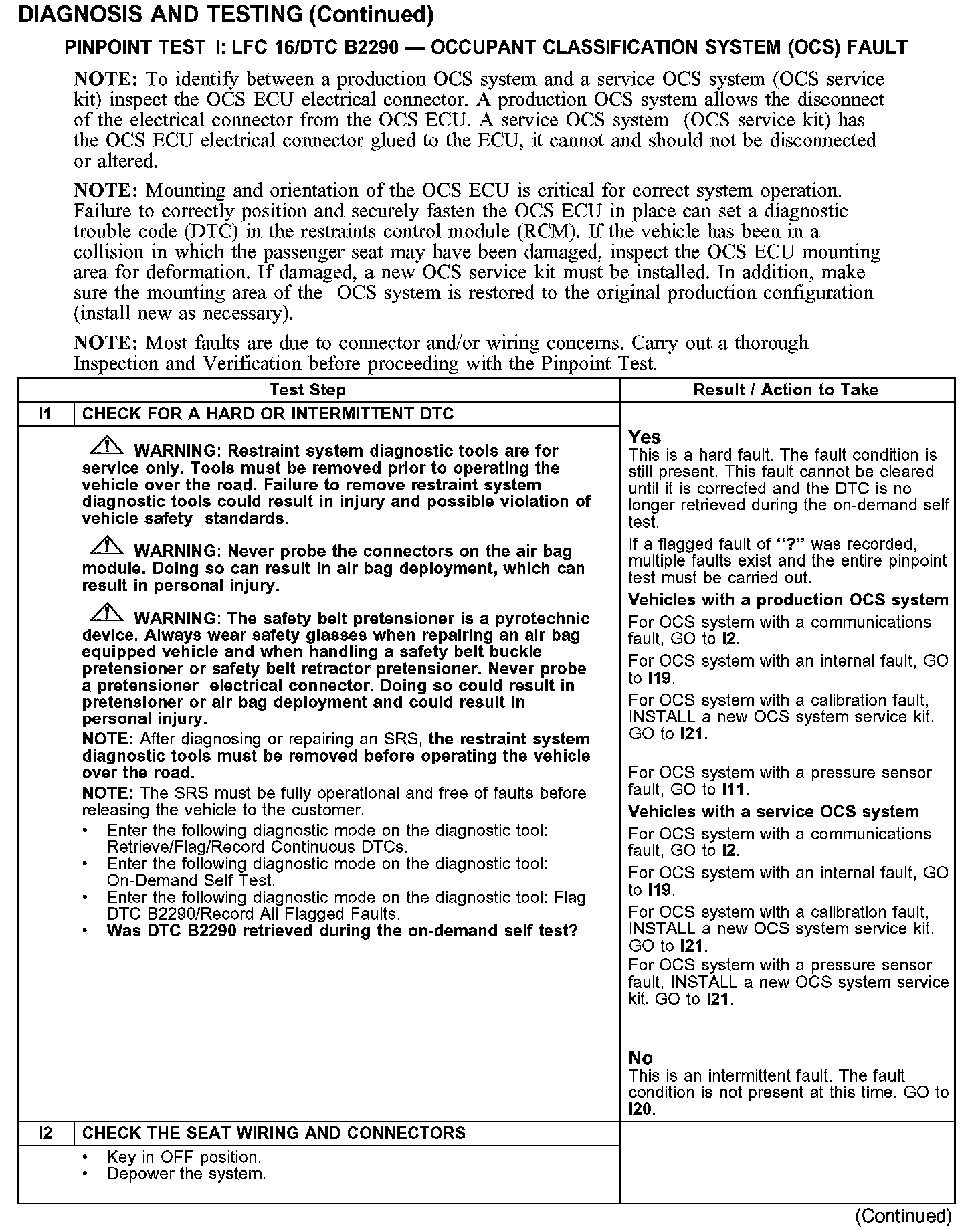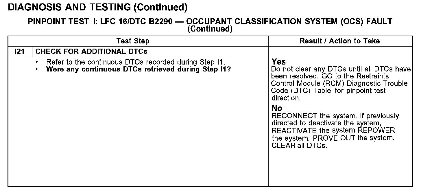PINPOINT TEST I: LFC 16/DTC B2290 - OCCUPANT CLASSIFICATION SYSTEM (OCS) FAULTTest I1-I2: