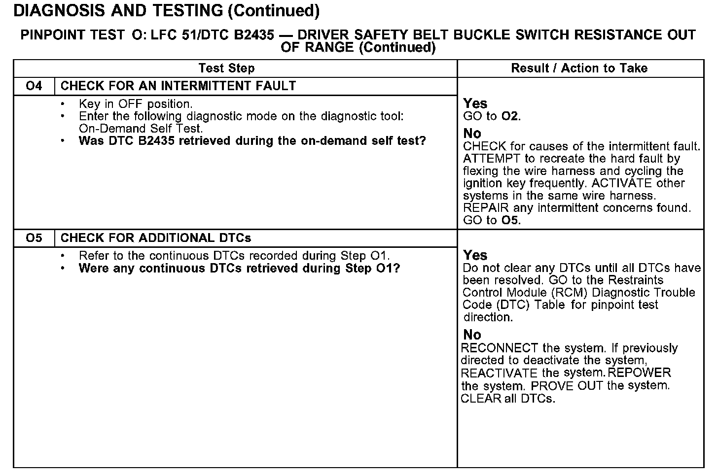 PINPOINT TEST O: LFC 51/DTC B2435 - DRIVER SAFETY BELT BUCKLE SWITCH RESISTANCE OUT OF RANGETest O1-O3: