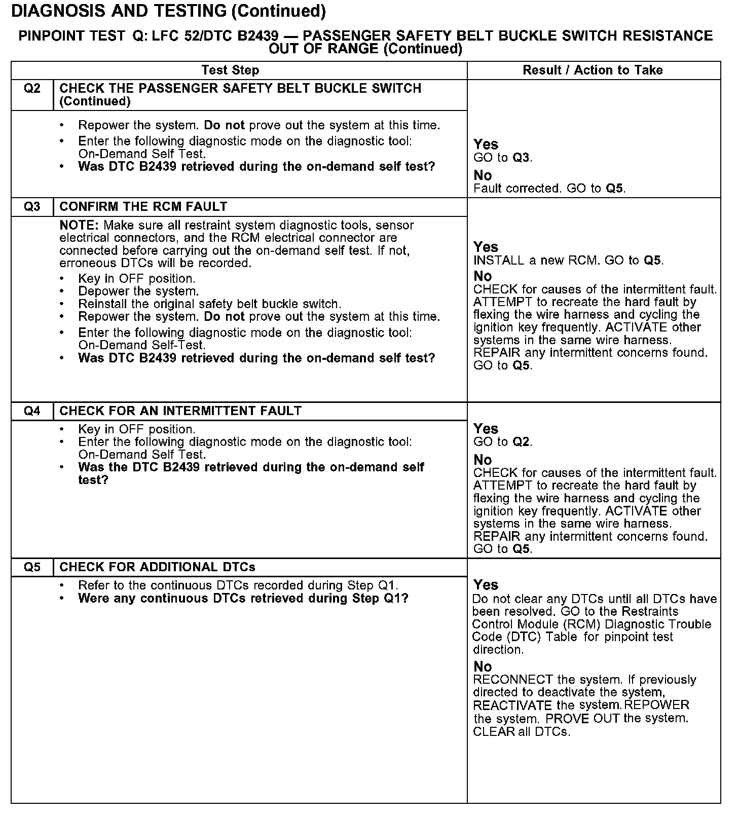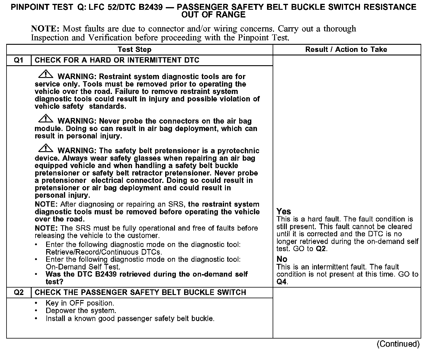 PINPOINT TEST Q: LFC 52/DTC B2439 - PASSENGER SAFETY BELT BUCKLE SWITCH RESISTANCE OUT OF RANGETest Q1-Q2: