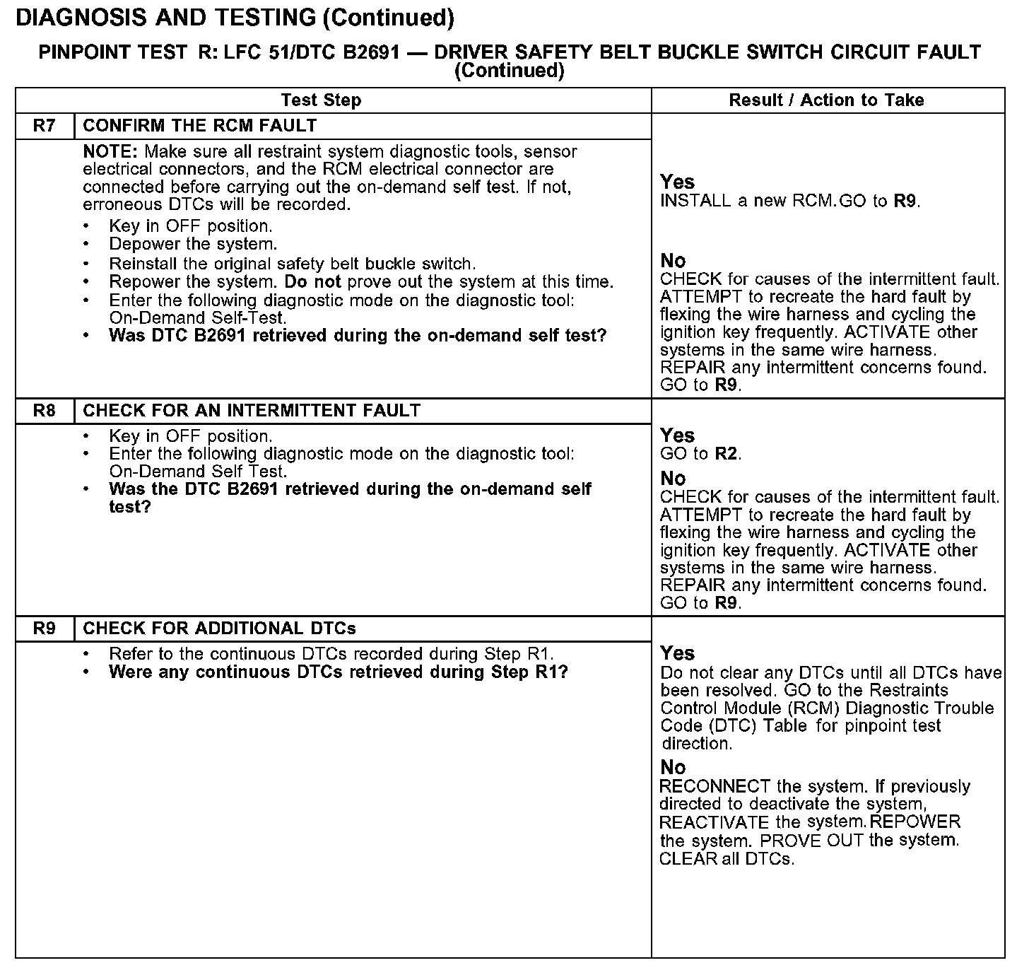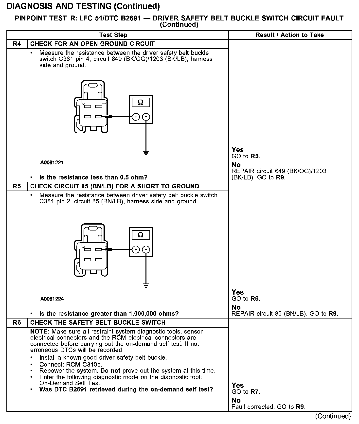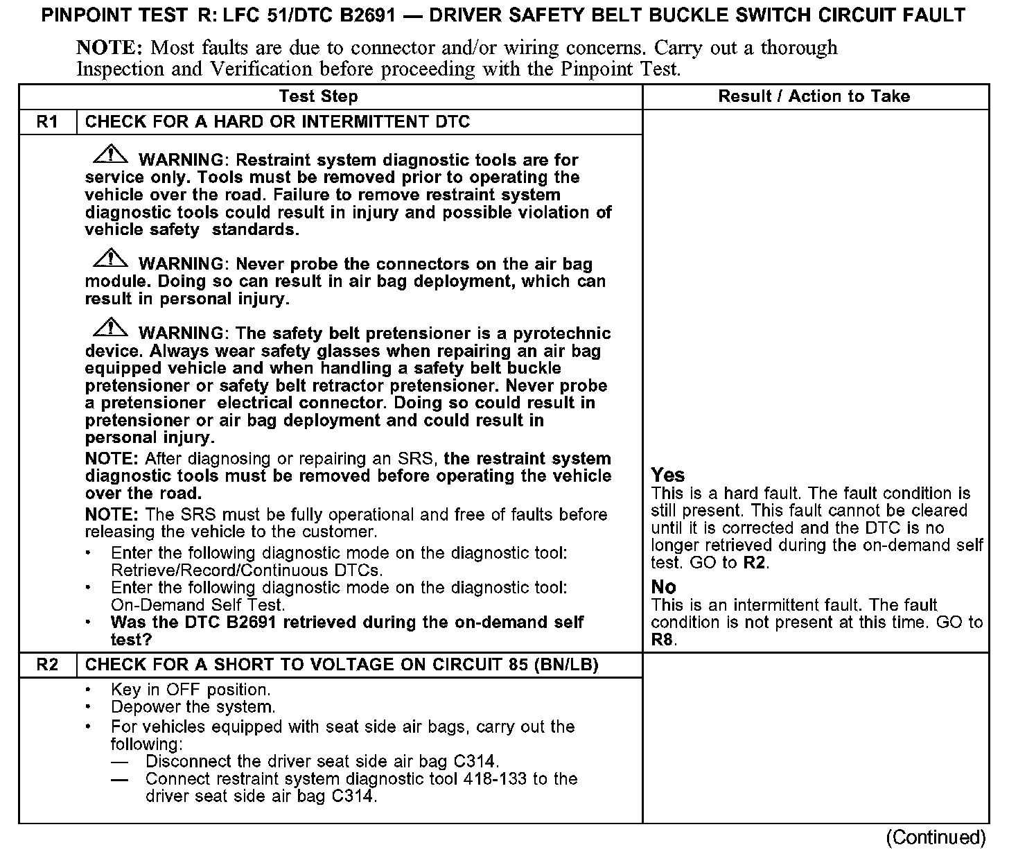 PINPOINT TEST R: LFC 51/DTC B2691 - DRIVER SAFETY BELT BUCKLE SWITCH CIRCUIT FAULTTest R1-R2: