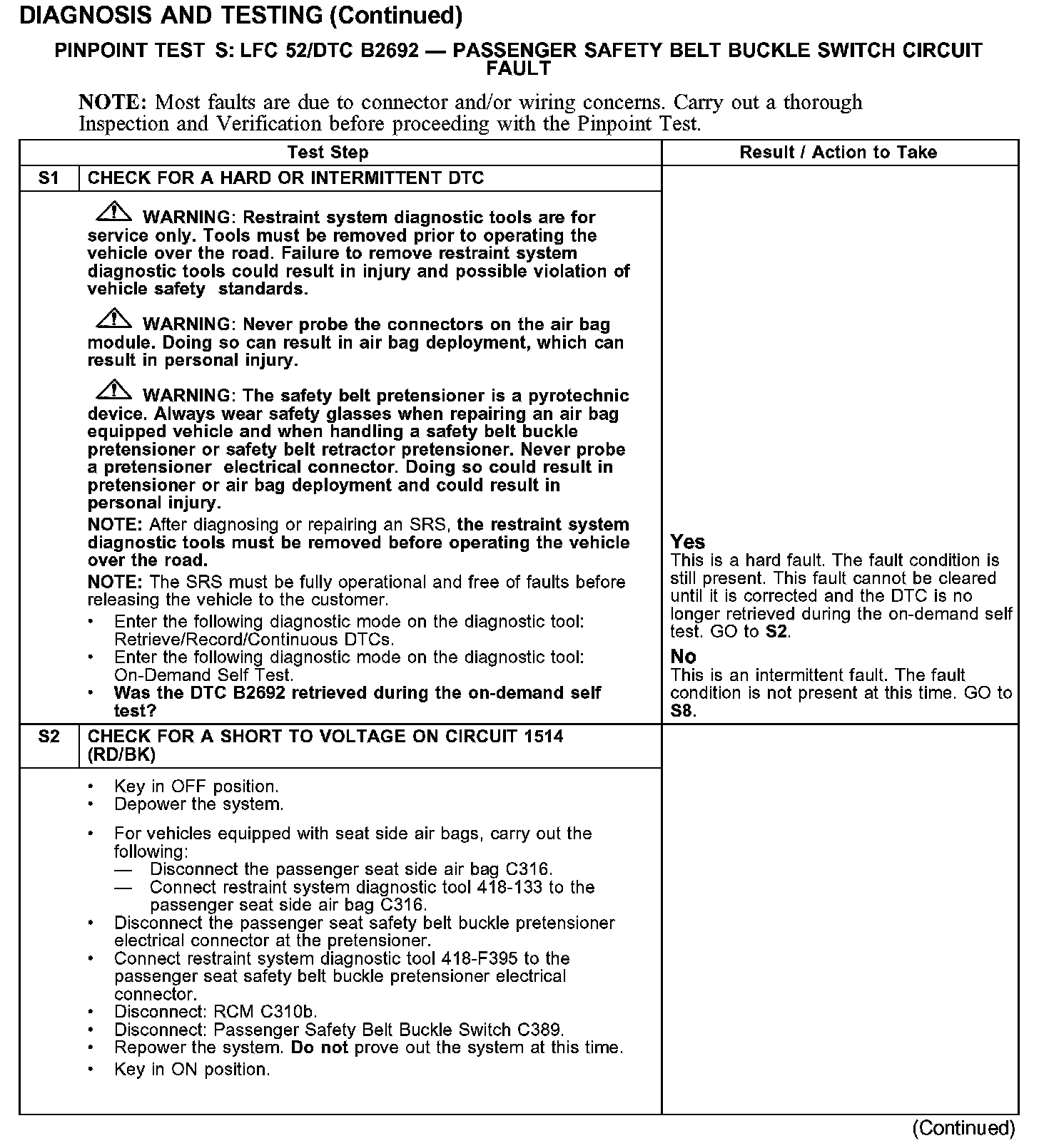 PINPOINT TEST S: LFC 52/DTC B2692 - PASSENGER SAFETY BELT BUCKLE SWITCH CIRCUIT FAULTTest S1-S2: