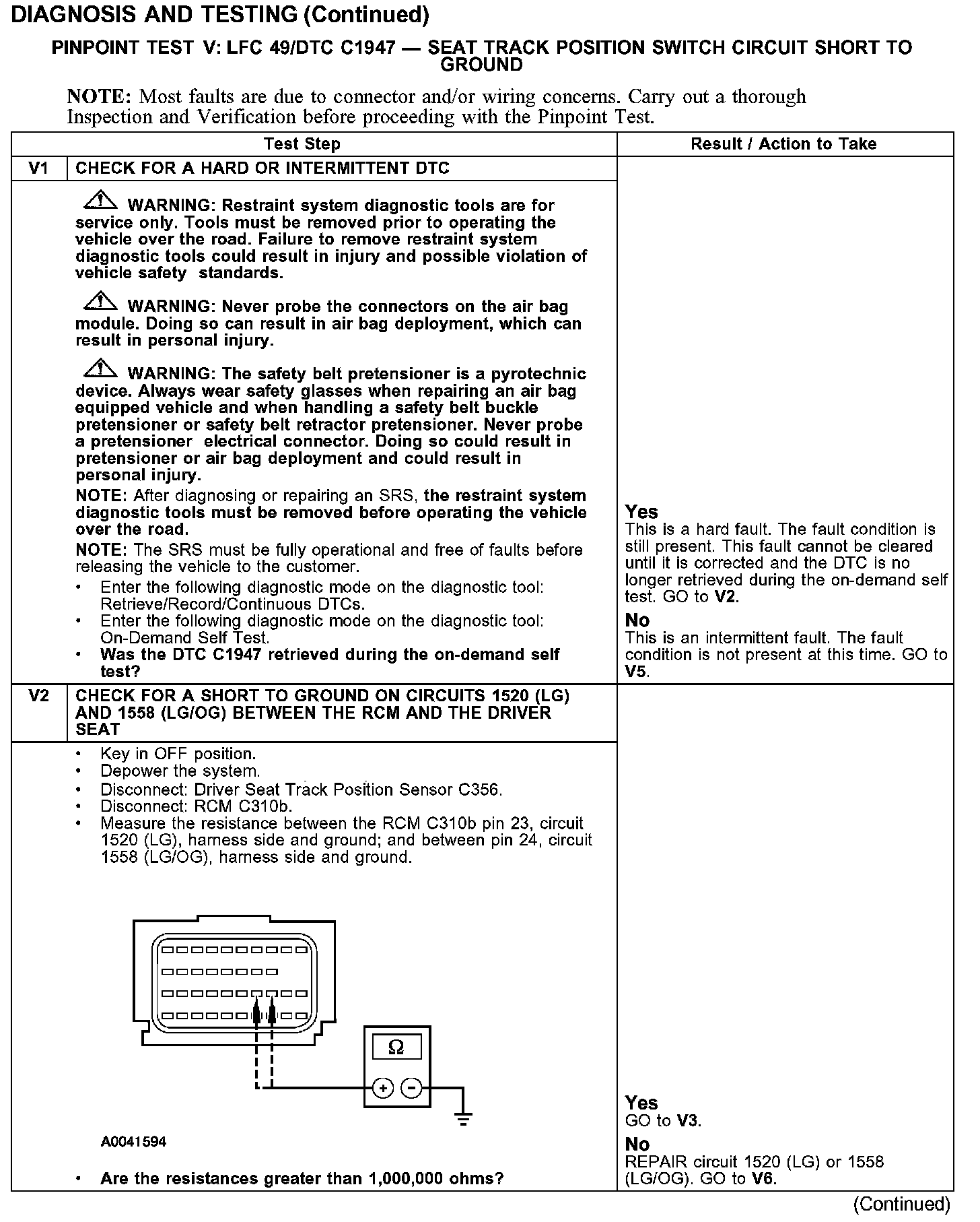 PINPOINT TEST V: LFC 49/DTC C1947 - SEAT TRACK POSITION SWITCH CIRCUIT SHORT TO GROUNDTest V1-V2: