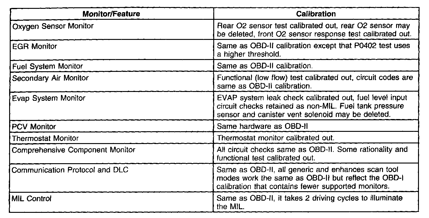 Vehicles not required to comply with OBD-II requirements will utilizes an OBD-I system. OBD-I systems are used on all Federal truck calibrations over 8,500 lbs. GVWR. OBD-I vehicles use the same data communication link, data link connector (DLC) and PCM software as the corresponding OBD-II vehicle. Differences between OBD-I and OBD-II vehicles may be removal of the rear oxygen sensor(s), fuel tank pressure sensor, canister vent solenoid and PCM calibration. The table lists what monitors and functions have been altered for the OBD-I calibration.