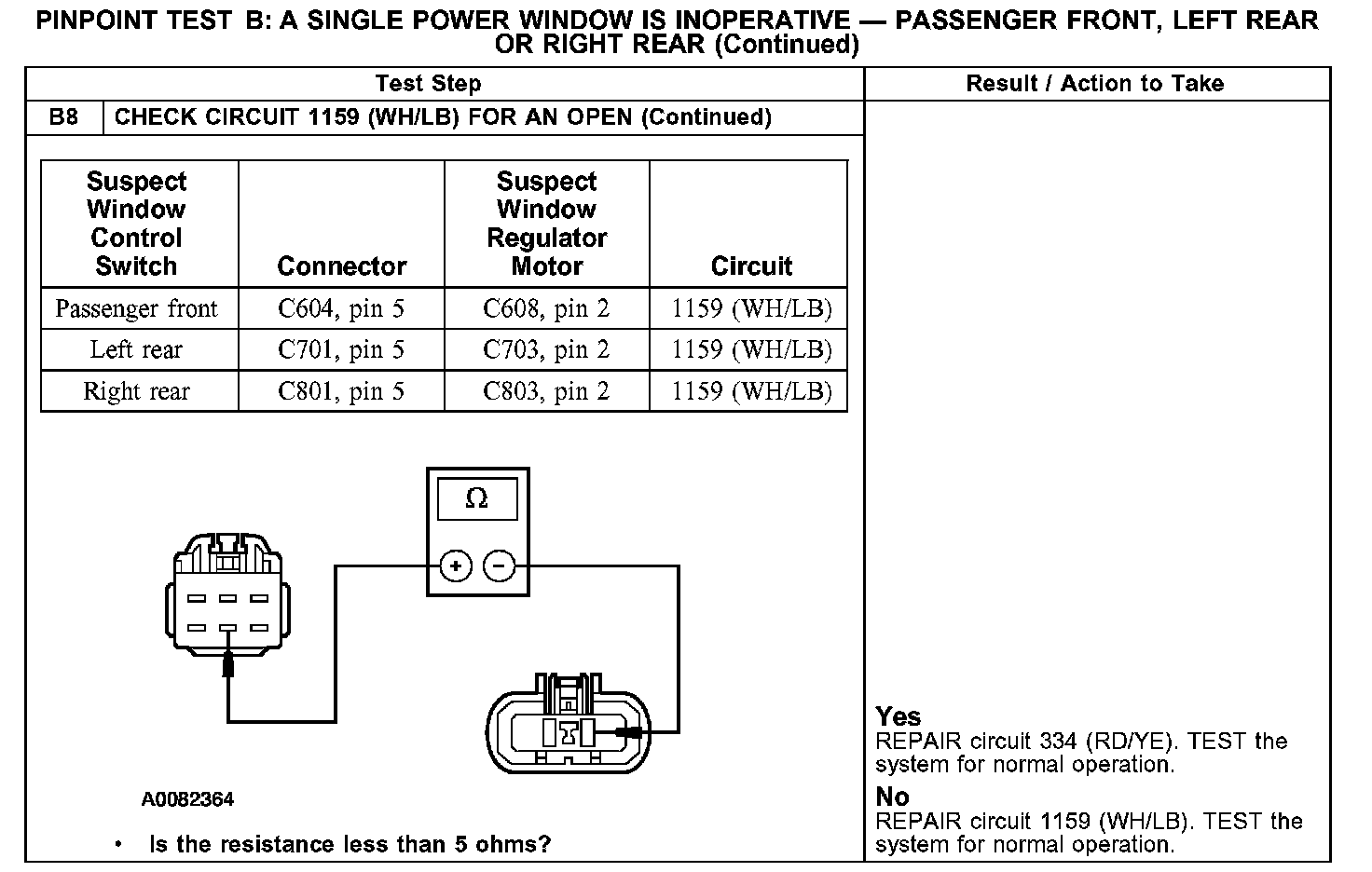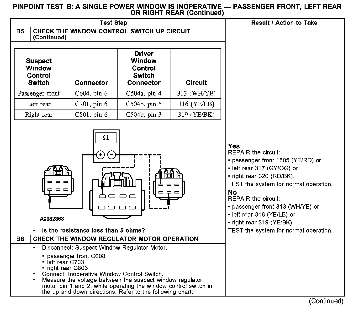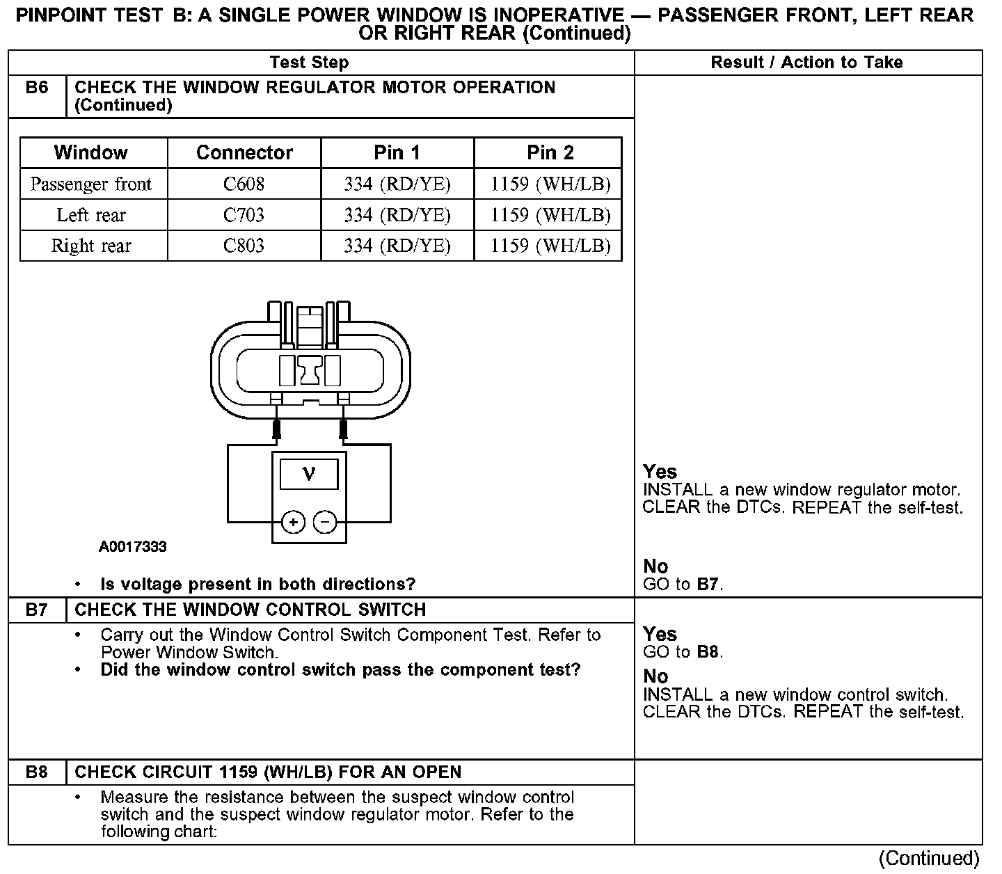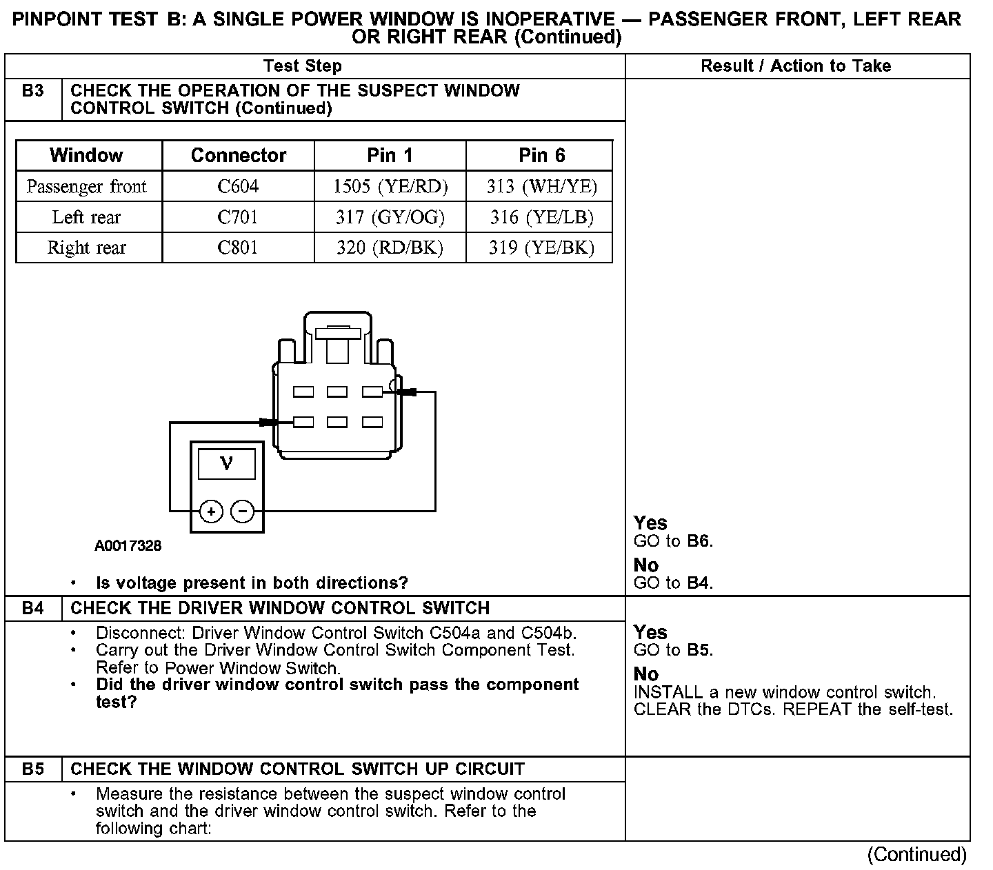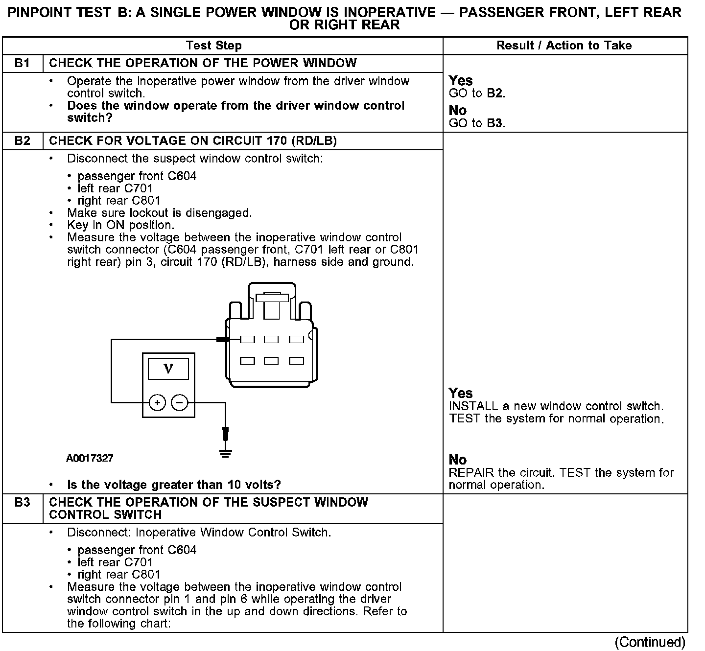 PINPOINT TEST B: A SINGLE POWER WINDOW IS INOPERATIVE - PASSENGER FRONT, LEFT REAR OR RIGHT REAR