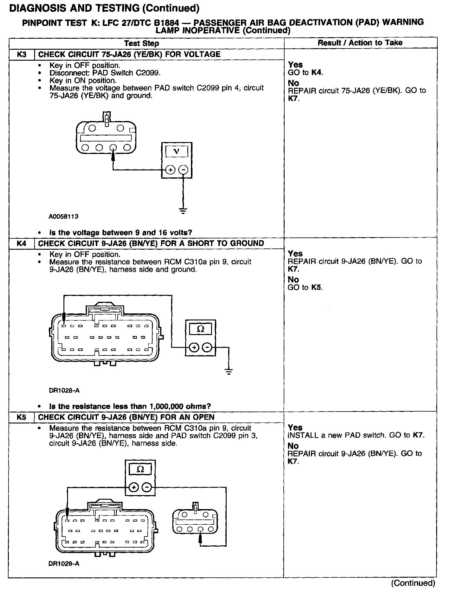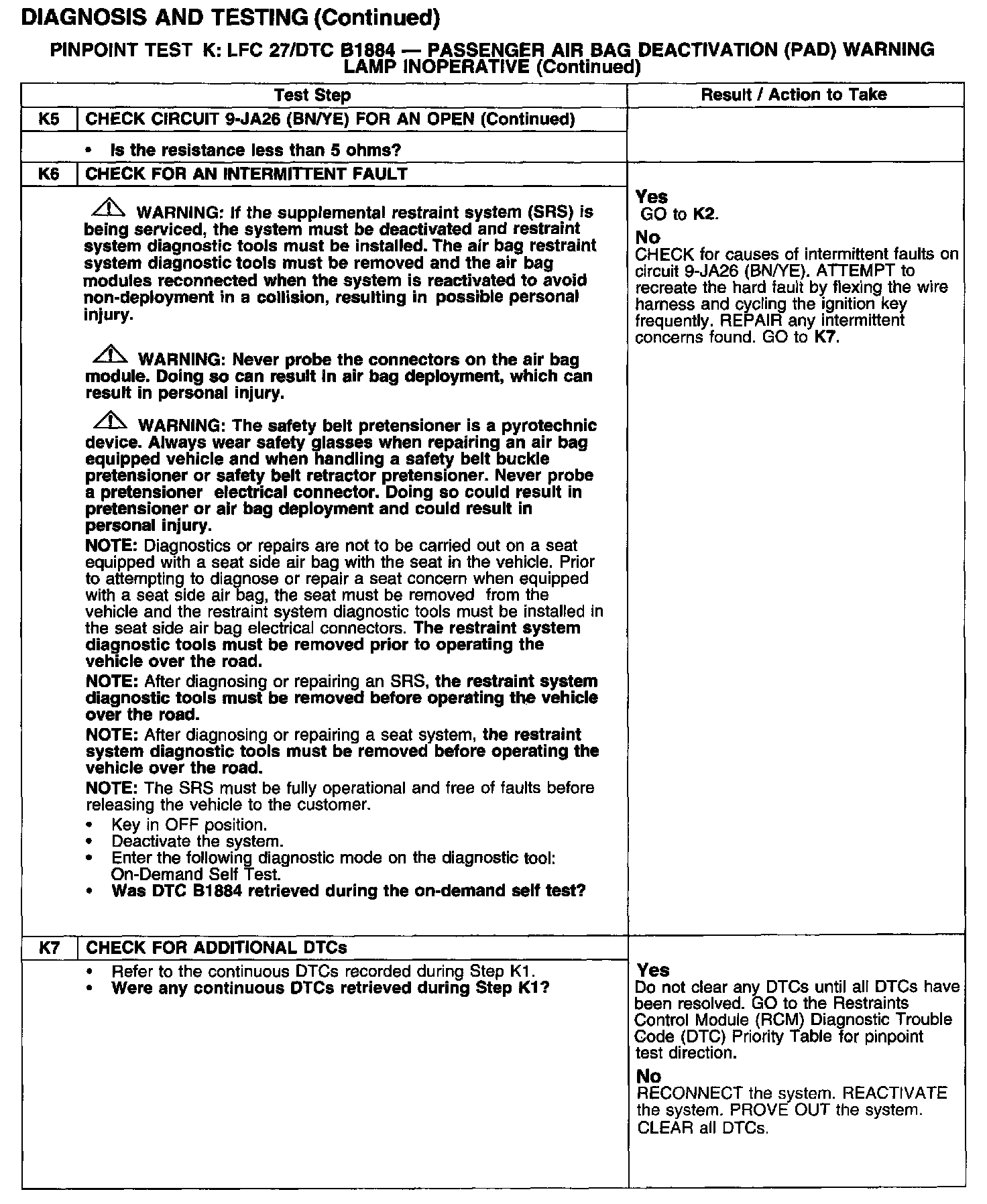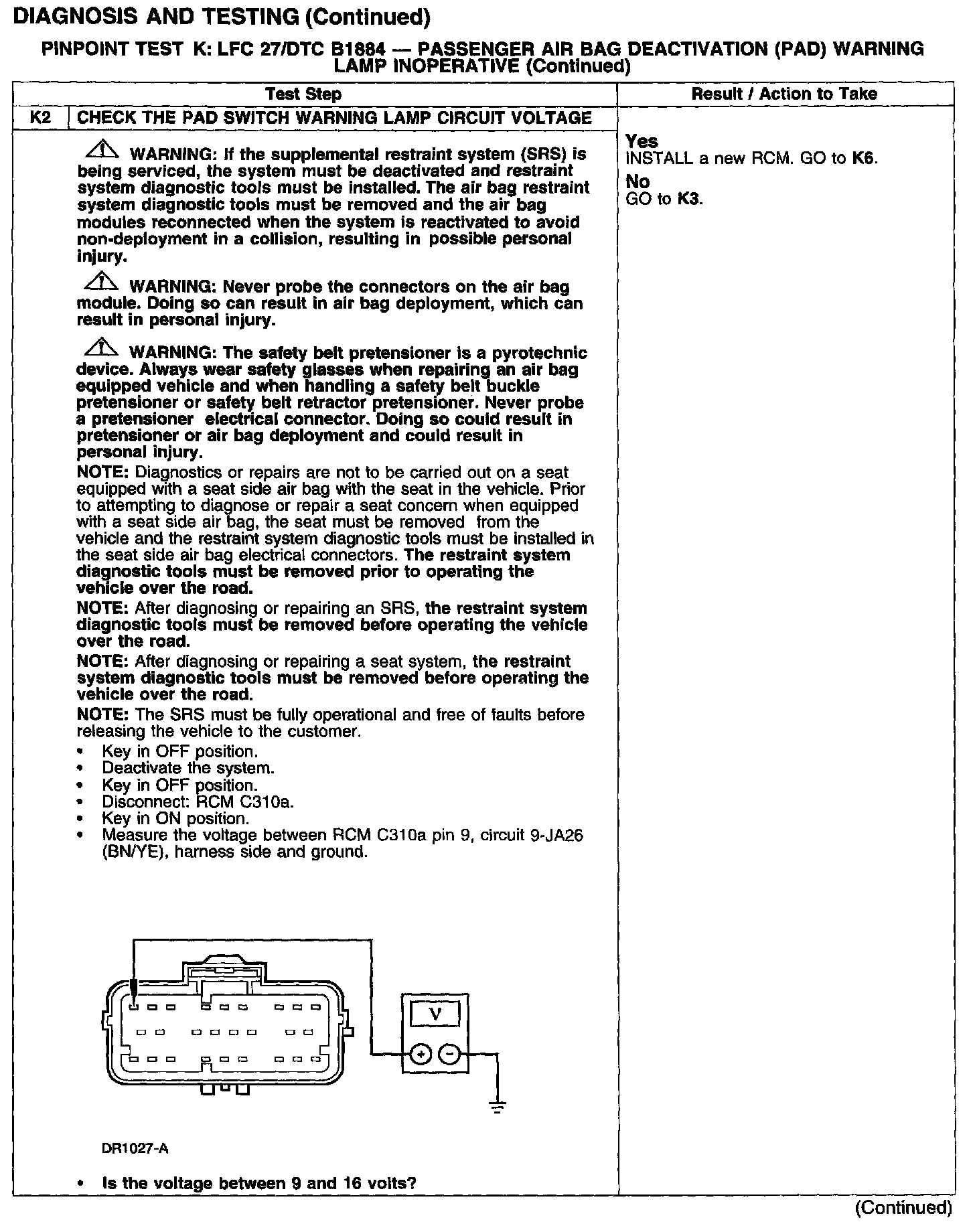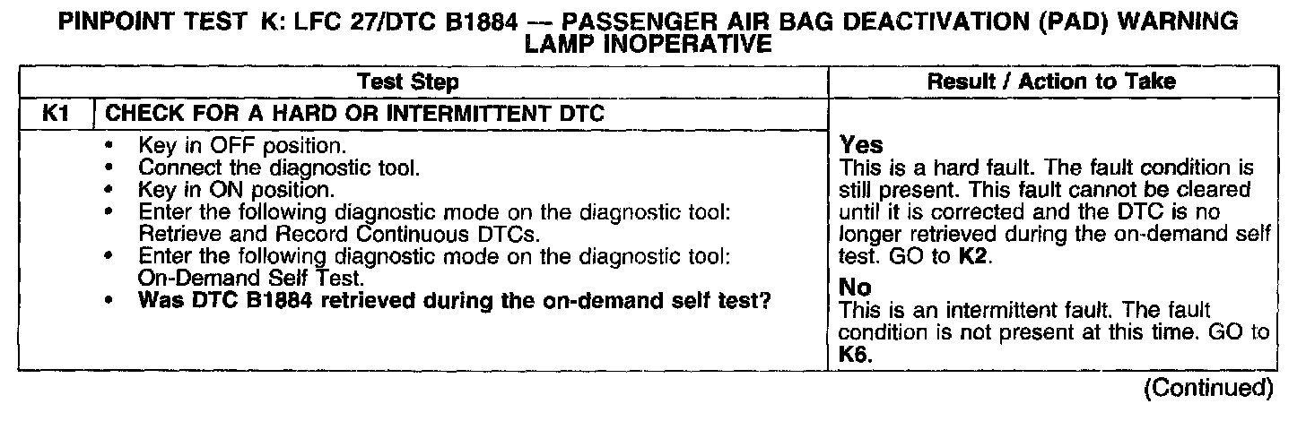 PINPOINT TEST K: LFC 27/DTC B1884 - PASSENGER AIR BAG DEACTIVATION (PAD) WARNING LAMP INOPERATIVETest K1: