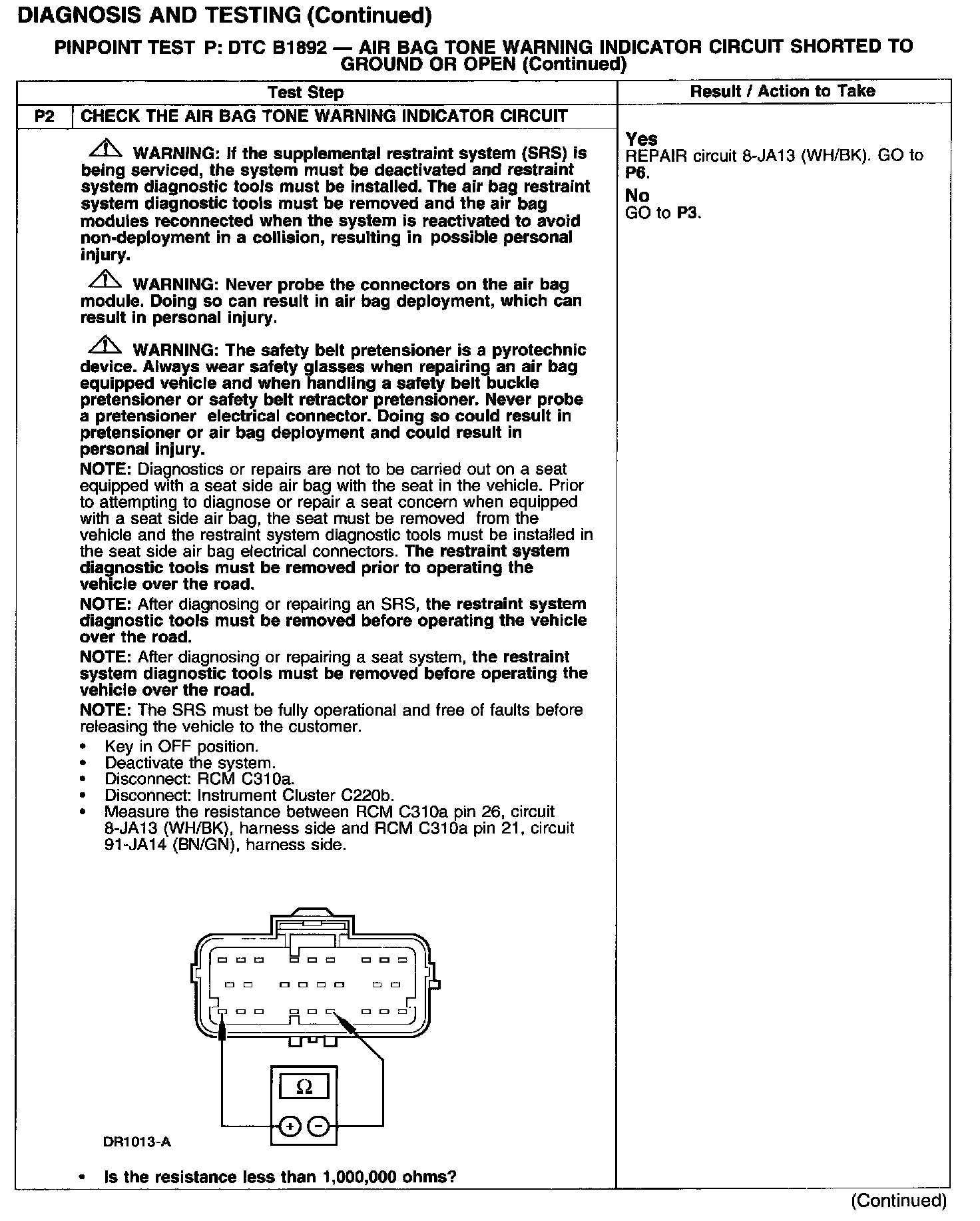 PINPOINT TEST P: B1892 - AIR BAG TONE WARNING INDICATOR CIRCUIT SHORTED TO GROUND OR OPENTest P1: