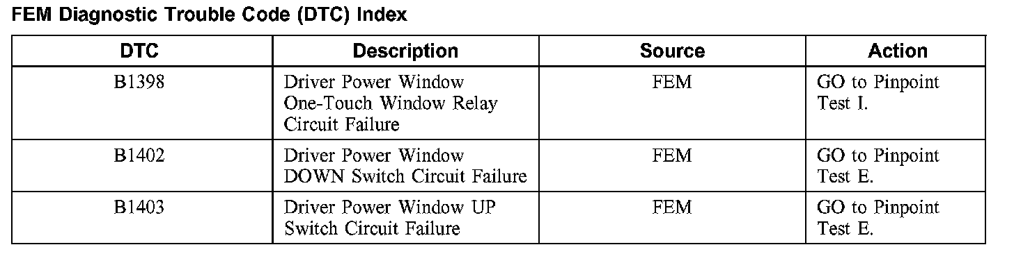 FEM Diagnostic Trouble Code (DTC) Index