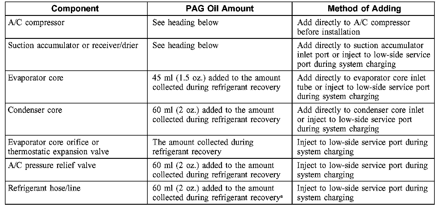 CAUTION: During normal A/C operation, oil is circulated through the system with the refrigerant, and a small amount is retained in each component. If certain components of the system are removed, some of the refrigerant oil will go with the component. To maintain the original total oil charge, it is necessary to compensate for the oil lost by adding oil to the system with the new part.