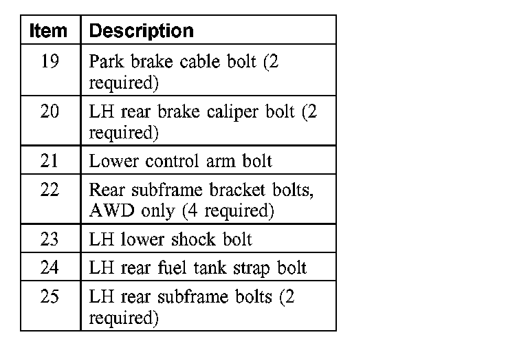 19. Correctly support the fuel tank and remove the LH rear fuel tank strap bolt.