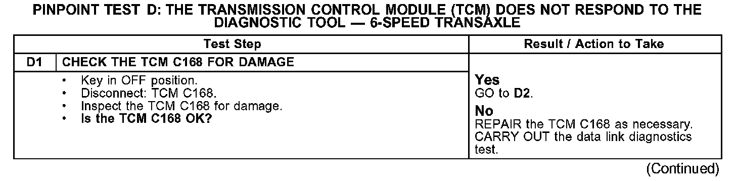 PINPOINT TEST D: THE TRANSMISSION CONTROL MODULE (TCM) DOES NOT RESPOND TO THE DIAGNOSTIC TOOL - 6-SPEED TRANSAXLED1: