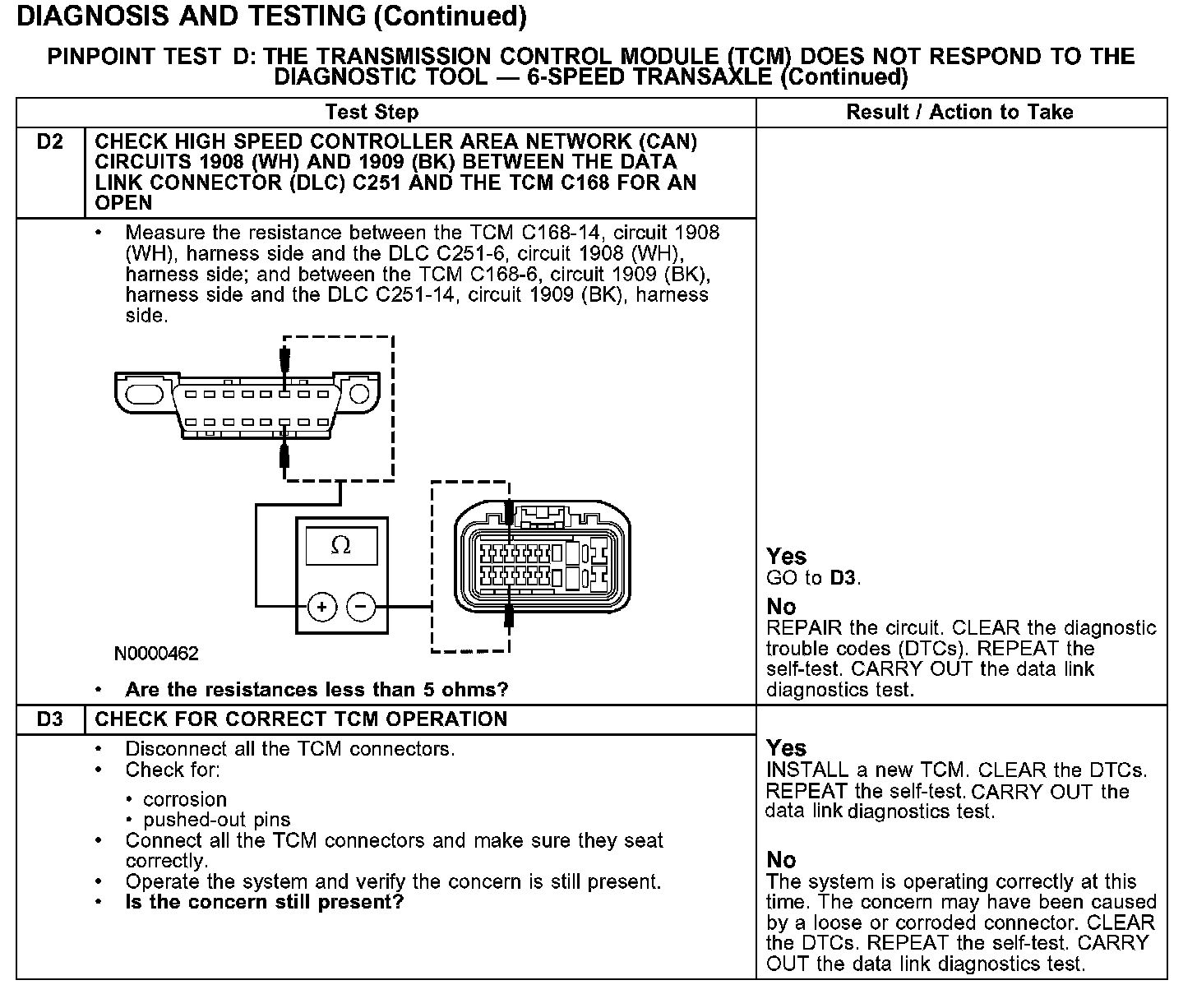 The TCM communicates with the diagnostic tool through the high speed controller area network (CAN), circuits 1908 (WH) and 1909 (BK). The high speed CAN remains operational with the severing of one of the high speed CAN circuits or if the data minus circuit is shorted to ground. Communication may also continue if one of the termination resistors is lost. The high speed CAN does not remain operational if the data plus circuit is shorted to ground or shorted to voltage. The high speed CAN also does not remain operational if the data minus circuit is shorted to voltage. Check circuits 1908 (WH) and 1909 (BK) between the TCM C168 and the data link connector (DLC) C251. The total resistance values must not be more than 5 ohms. If the resistance is more than 5 ohms there is an open in one of the high speed CAN circuits, damage to the DLC C251, damage to the TCM C168, or a problem in an in-line connector.