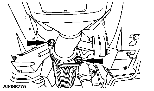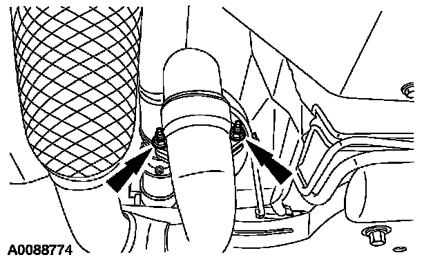 7. Position the catalytic converter pipe, install the 2 catalytic converter pipe bolts and connect the rubber hanger.