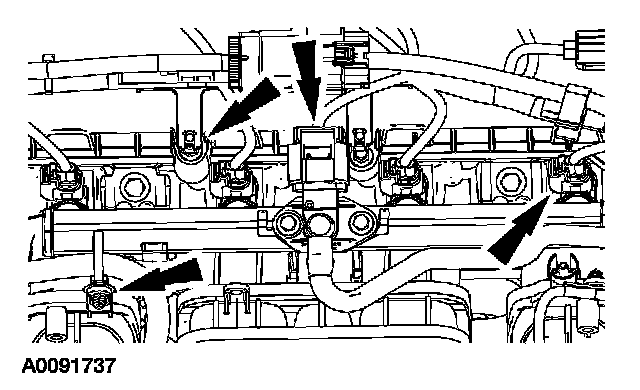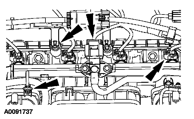7. Disconnect the fuel rail pressure and temperature sensor and the fuel injector electrical connectors. Detach the wiring harness retainers.