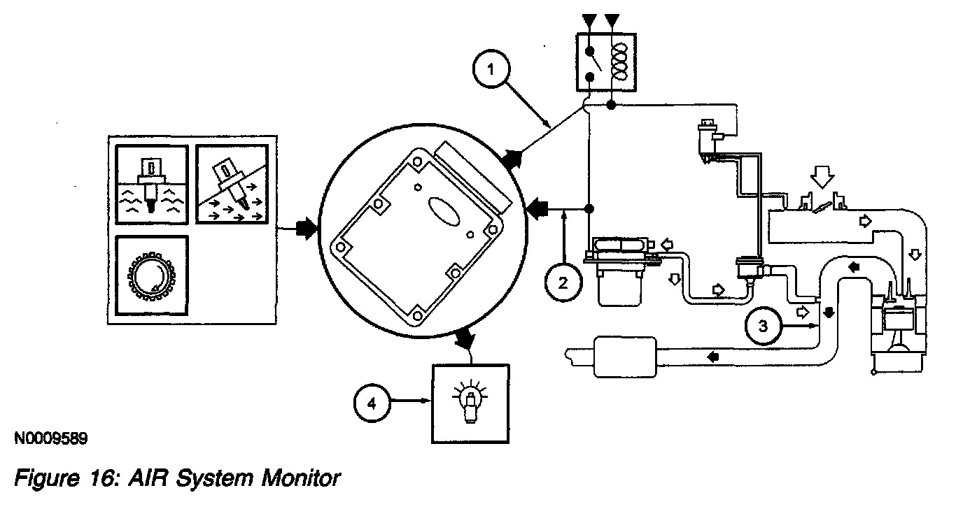 1. On the primary side of the AIR relay, open and short circuit faults are detected during normal operation by the PCM output driver. This circuit energizes the relay and the vacuum-operated check and solenoid control valves.