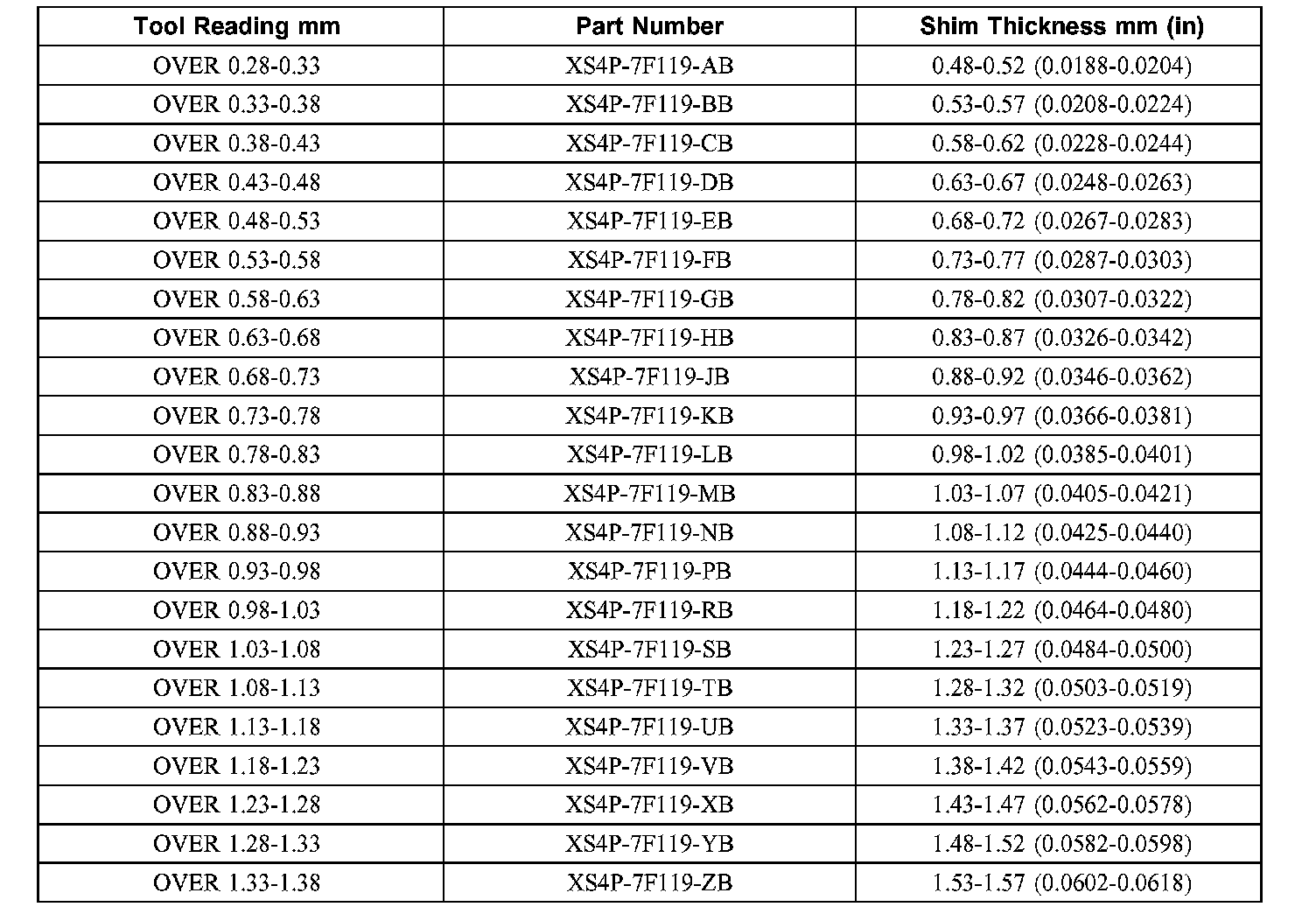 Differential Shaft Shim Selection Chart