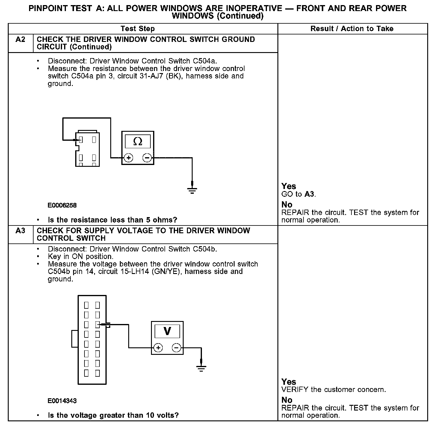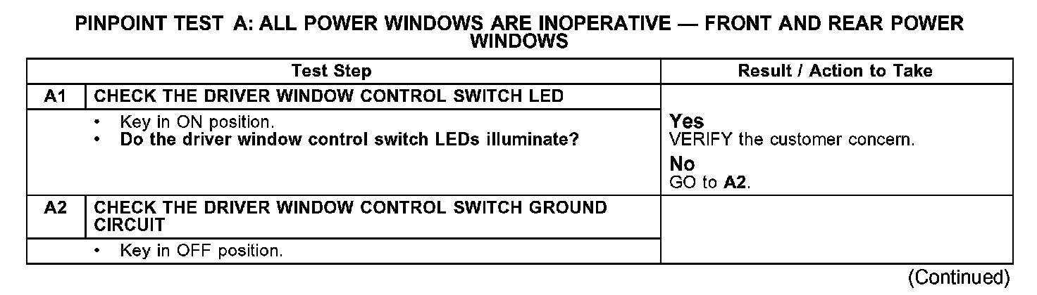 PINPOINT TEST A: ALL POWER WINDOWS ARE INOPERATIVE - FRONT AND REAR POWER WINDOWS