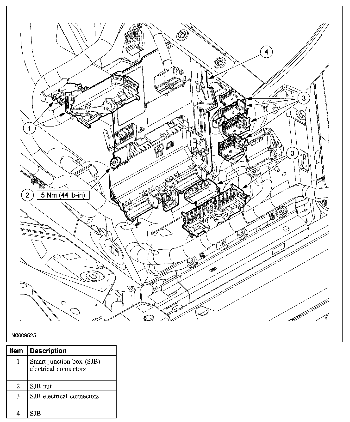 8. CAUTION: Make sure that the wiring harnesses are correctly routed. Pinching the wiring harnesses between the SJB and it's mounting surface may cause damage to the wiring harness.