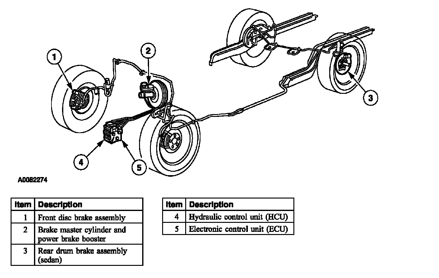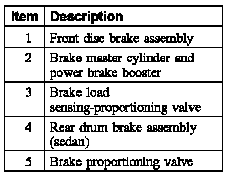 Brake SystemVehicles equipped with anti-lock brake system (ABS) and ABS/traction control do not use a proportioning valve. Hydraulic pressure to the brake assemblies is controlled by the hydraulic control unit (HCU) as directed by the electronic control unit (ECU). Non-ABS station wagons use 4-wheel disc brakes and are equipped with a proportioning valve in the engine compartment. Non-ABS sedans use drum brakes in the rear and are equipped with a junction block in the engine compartment and a brake load sensing-proportioning valve in the rear. During braking, weight is shifted to the front of the vehicle, causing the rear to rise. The brake load sensing-proportioning valve is mounted on the body and is attached to the rear suspension lower control arm. As the body and suspension separate, the valve proportions pressure to the rear wheels to prevent premature rear brake lock-up.