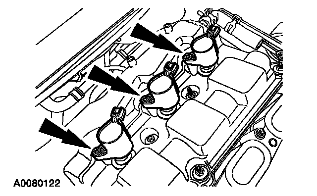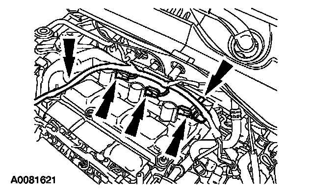 Disconnect the coil-on-plug electrical connectors and detach the wiring harness retainers.