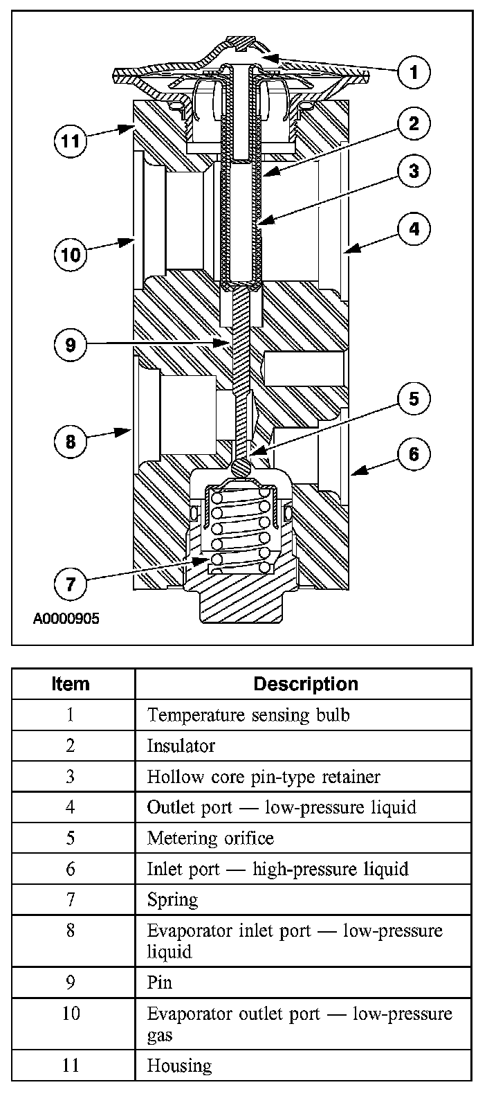 The TXV is located between the evaporator core lines and the thermostatic expansion valve manifold and tube assembly at the rear of the engine compartment. The TXV provides a restriction to the flow of refrigerant from the high pressure side of the refrigerant system, and separates the low pressure and high pressure sides of the refrigerant system. Refrigerant entering and exiting the evaporator core passes through the TXV through 2 separate flow paths. An internal temperature sensing bulb senses the temperature of the refrigerant flowing out of the evaporator core and adjusts an internal pin-type valve to meter the refrigerant flow into the evaporator core. The internal pin-type valve decreases the amount of refrigerant entering the evaporator core at lower temperatures, and increases the amount of refrigerant entering the evaporator core at higher temperatures.