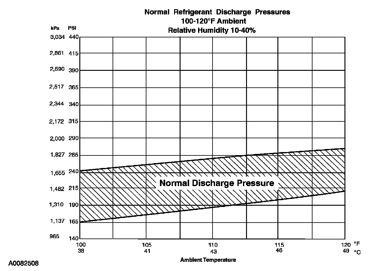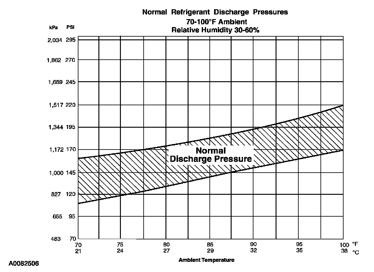 8. Determine if the discharge pressure falls within the normal operating limits using the Normal Refrigerant Discharge Pressures chart.
