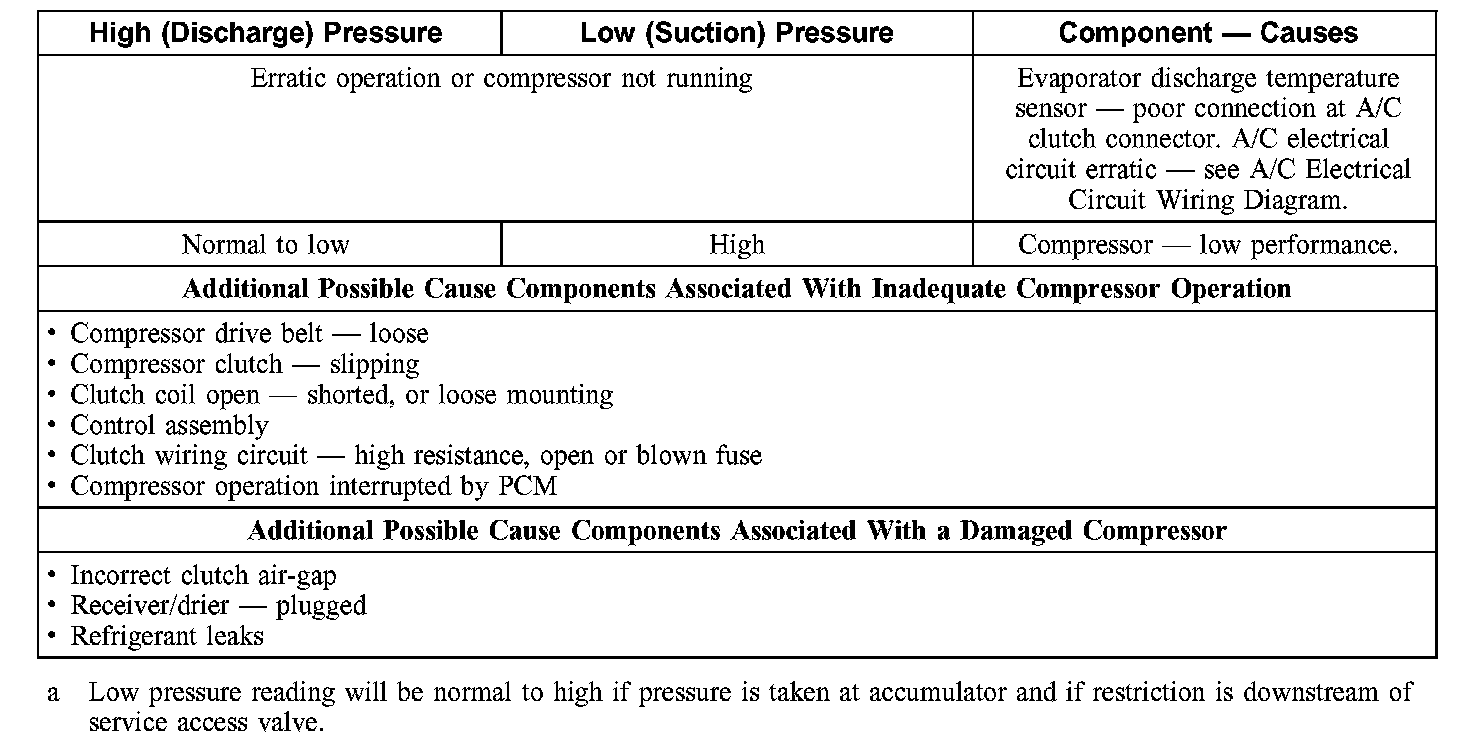 1. NOTE: The following table is used to guide diagnosis of the refrigerant system if operating pressures are outside normal limits.