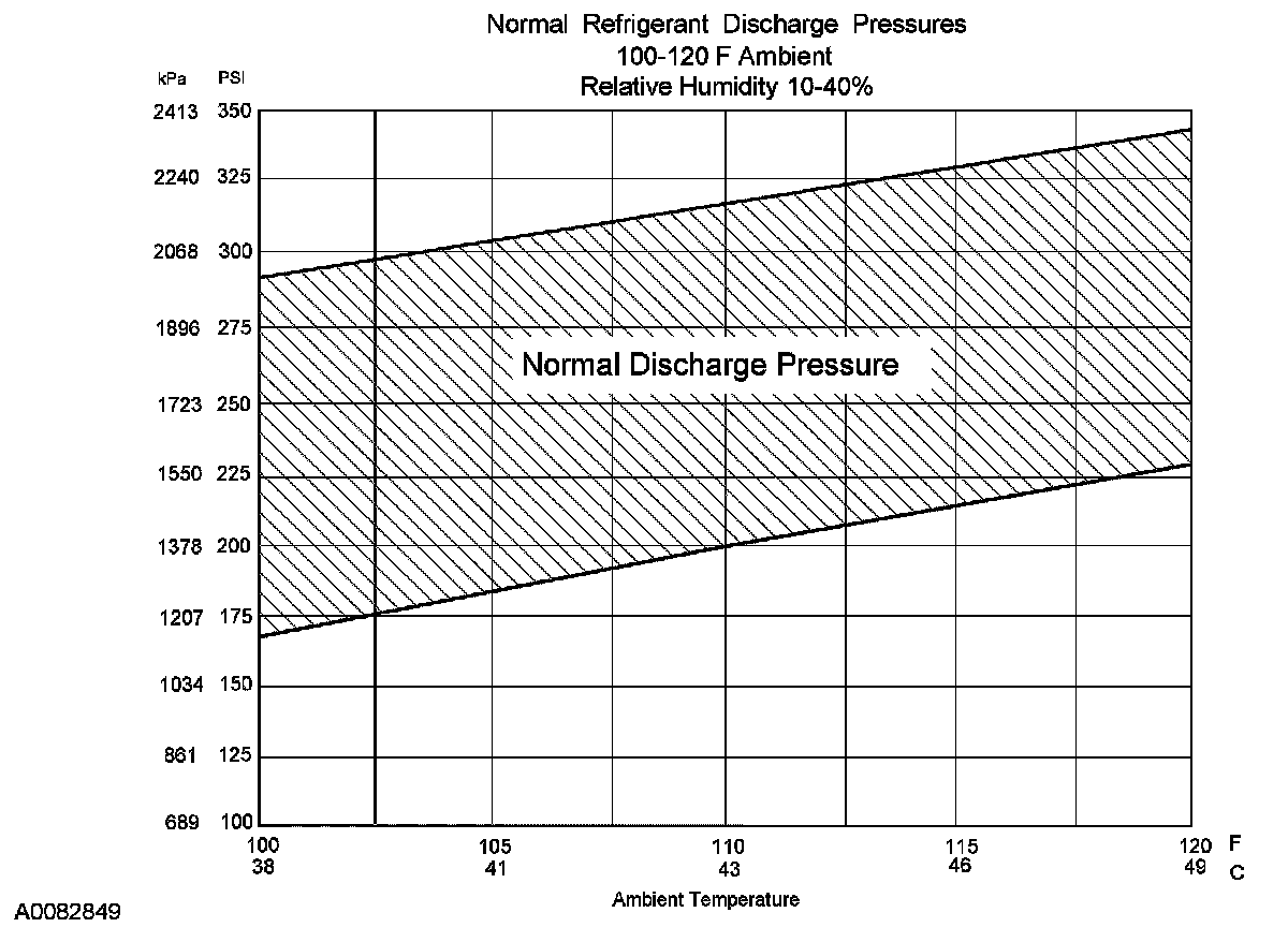 8. Determine if the discharge pressure falls within the normal operating limits using the Normal Refrigerant Discharge Pressures chart.