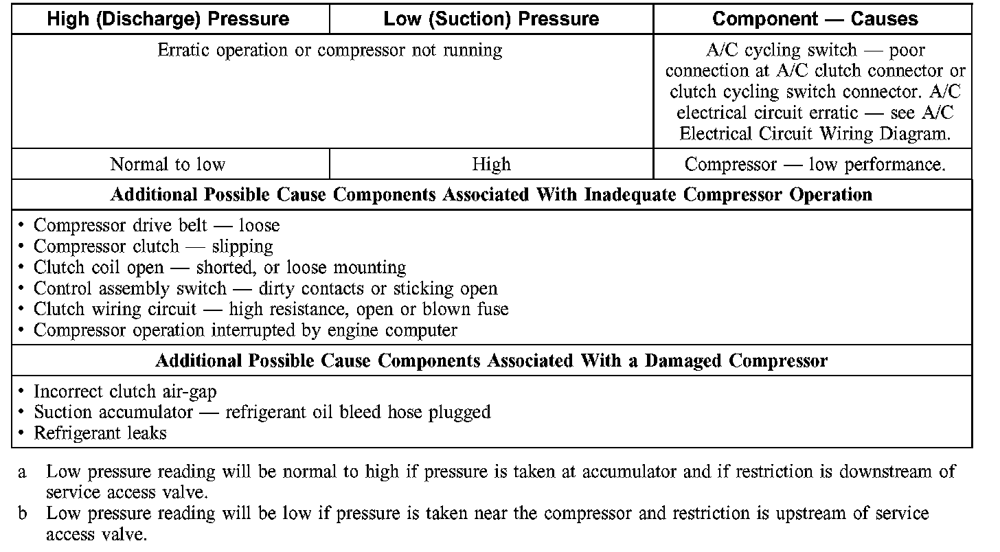 1. NOTE: The table is used to guide diagnosis of the refrigerant system if operating pressures are outside normal limits.