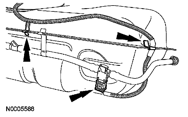 2. Disconnect the pressure transducer electrical connector on the top rear corner of the fuel tank and release the 2 harness retainers from the tank.