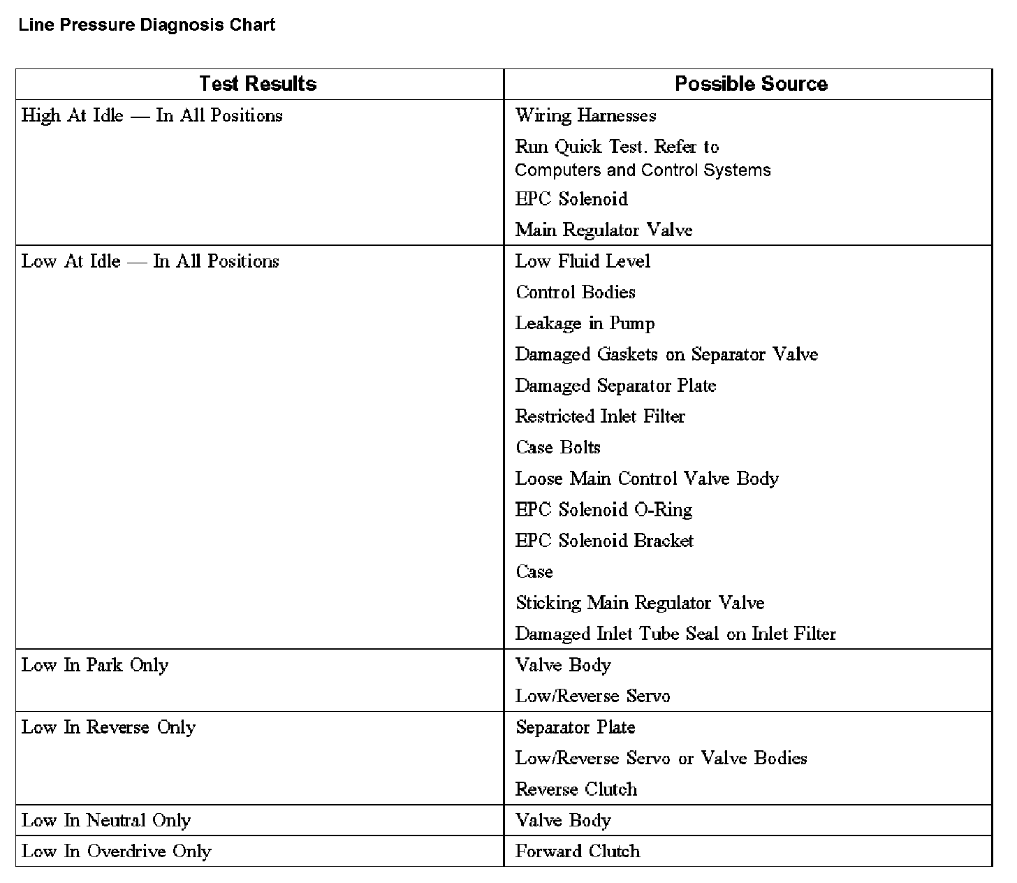 5. Start engine and check EPC pressure. Refer to the Line Pressure Chart.
