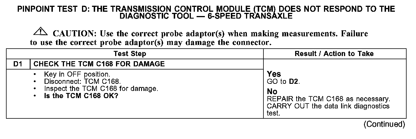 PINPOINT TEST D: THE TRANSMISSION CONTROL MODULE (TCM) DOES NOT RESPOND TO THE DIAGNOSTIC TOOL - 6-SPEED TRANSAXLED1: