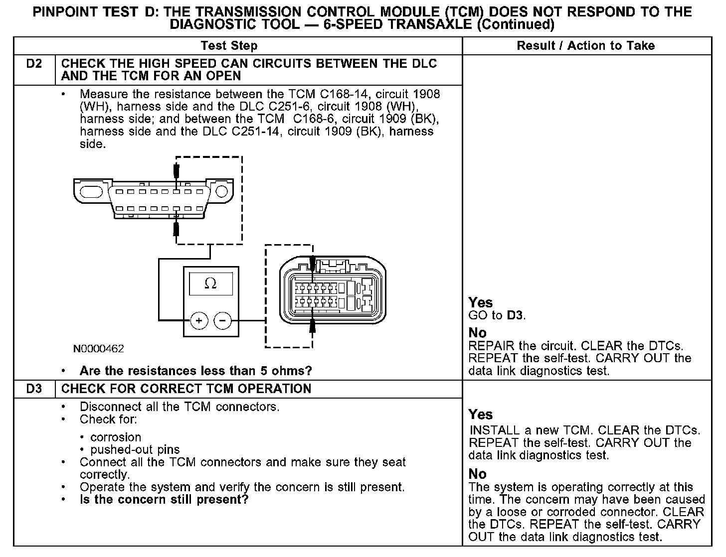 The TCM communicates with the diagnostic tool through the high speed controller area network (CAN), circuits 1908 (WH) and 1909 (BK). The high speed CAN is not designed to operate under single point fault conditions. If either circuit is shorted to voltage or the high speed CAN data plus is shorted to ground, module-to-module and module-to-tester communication is not possible. If the high speed CAN data minus is shorted to ground or an open exists on either bus line, module-to-module and module-to-tester communication is marginal at best. The high speed CAN bus may remain operational when one of the two termination resistors are not present. Check circuits 1908 (WH) and 1909 (BK) between the TCM C168 and the data link connector (DLC) C251. The total resistance values must not be more than 5 ohms. If the resistance is more than 5 ohms there is an open in one of the high speed CAN circuits, damage to the DLC C251, damage to the TCM C168, or a problem in an in-line connector.