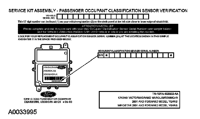 If a new OCS was installed, fill out the necessary information on the OCS traceability card and return it along with the complete inoperative occupant classification sensor to Ford Motor Company.