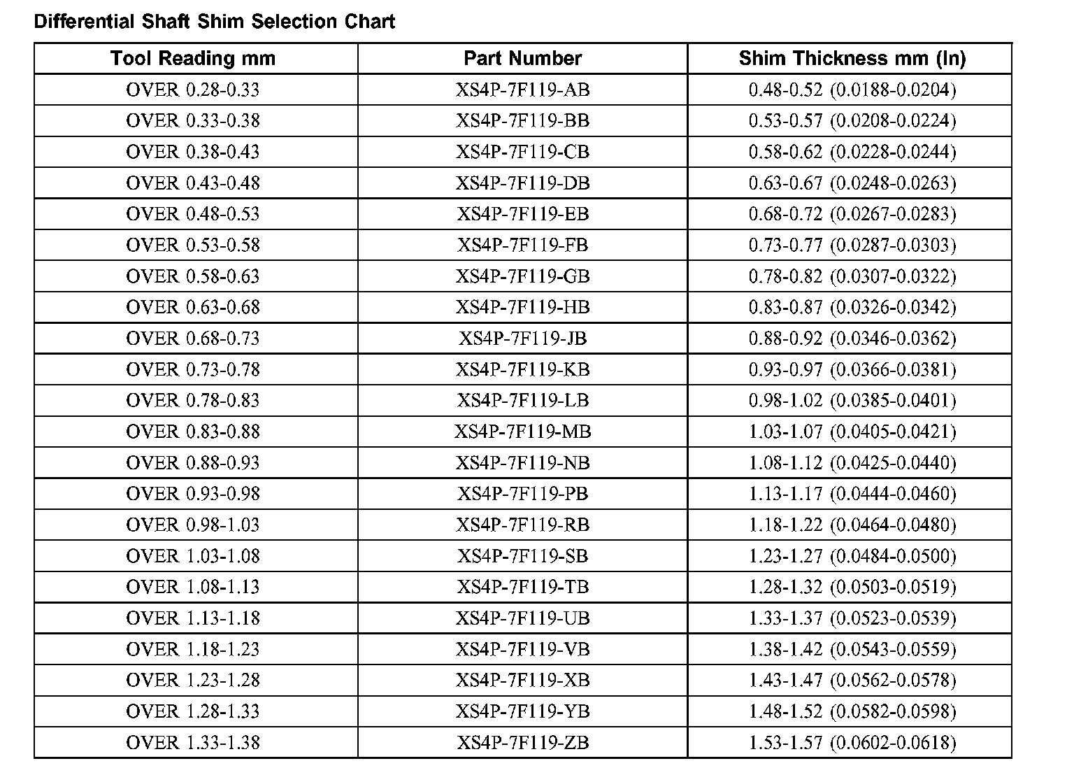 Differential Shaft Shim Selection Chart:
