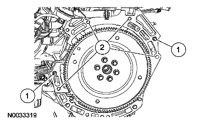 9. NOTE: If new parts are not being used, be sure to align the marks on the flexplate and the stud made during engine removal.