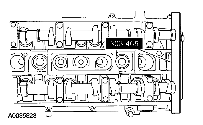 9. CAUTION: The special tool 303-465 is for camshaft alignment only. Using this tool to prevent engine rotation can result in engine damage.
