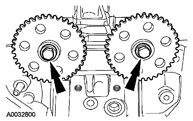 3. If removed, install the camshaft sprockets and the bolts. Do not tighten the bolts at this time.