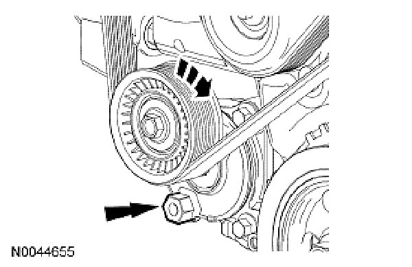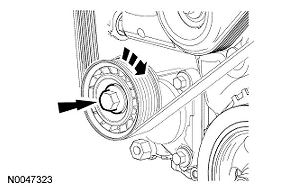 3. Using the pulley bolt, rotate the accessory drive belt tensioner clockwise and remove the accessory drive belt.