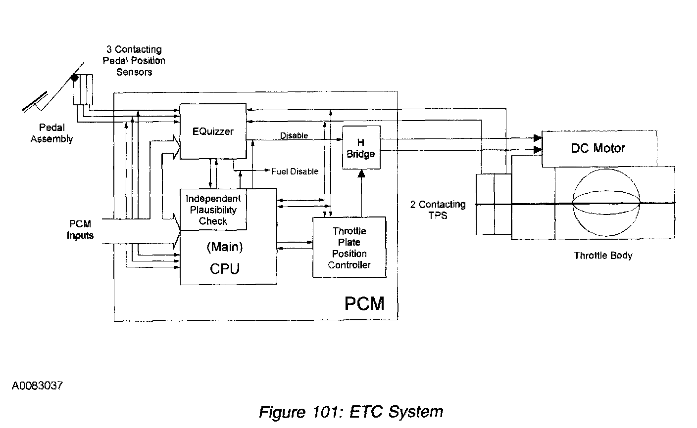 The ETC monitor system is distributed across 2 processors within the PCM: the main powertrain control processor unit (CPU) and a monitoring processor called an enhanced-quizzer (E-Quizzer) processor. The primary monitoring function is carried out by the independent plausibility check (IPC) software, which resides on the main processor. It is responsible for determining the driver-demanded torque and comparing it to an estimate of the actual torque delivered. If the generated torque exceeds driver demand by a specified amount, the IPC takes appropriate corrective action.