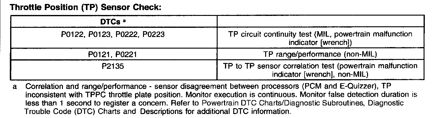 6. The throttle position (TP) sensor has 2 signal circuits in the sensor for redundancy. The redundant throttle position signals are required for increased monitoring reasons. The first TP signal (TP1) has a negative slope (increasing angle, decreasing voltage) and the second signal (TP2) has a positive slope (increasing angle, increasing voltage). During normal operation the negative slope TP signal (TP1) is used by the control strategy as the indication of throttle position. The TP sensor assembly requires 4 circuits.