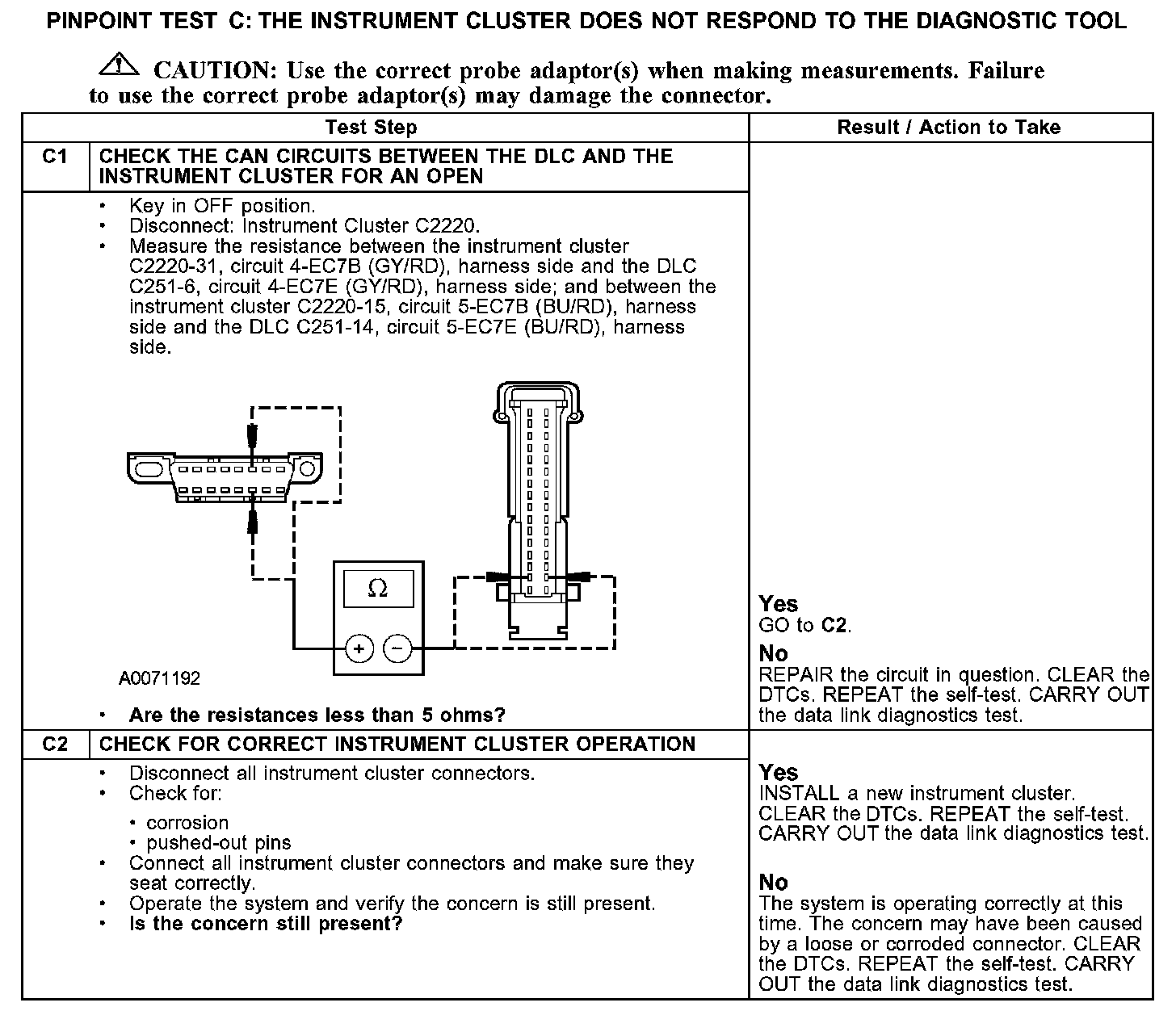 The instrument cluster communicates with the diagnostic tool through the controller area network (CAN), circuits 4-EC7B (GY/RD) and 5-EC7B (BU/RD). Check circuits 4-EC7B (GY/RD) and 5-EC7B (BU/RD) between the instrument cluster C2220 and the data link connector (DLC) C251. The total resistance values must not be more than 5 ohms. If the resistance is more than 5 ohms there is an open in one of the high speed CAN circuits, damage to the DLC C251, damage to the instrument cluster C2220, or a problem in an in-line connector.