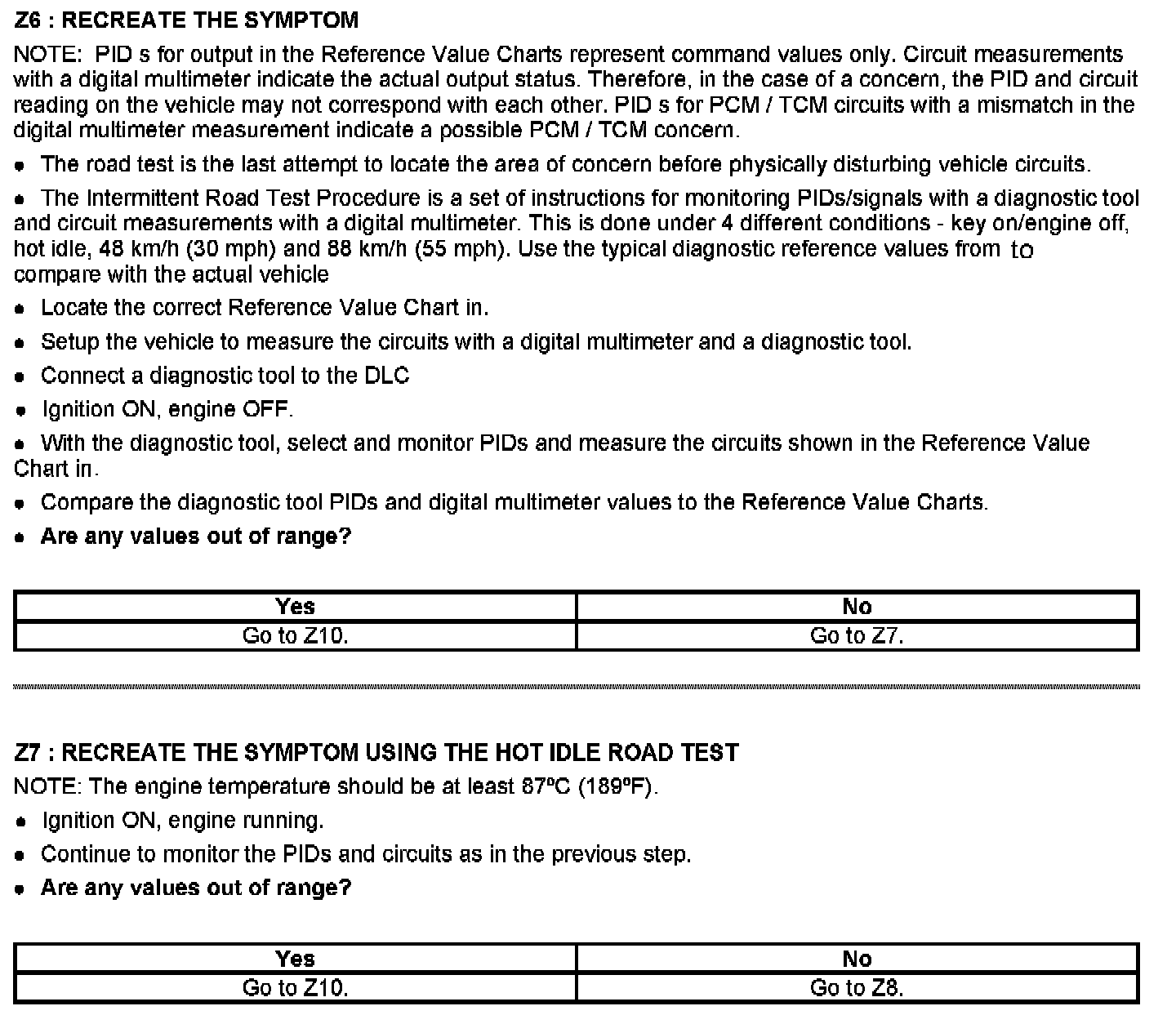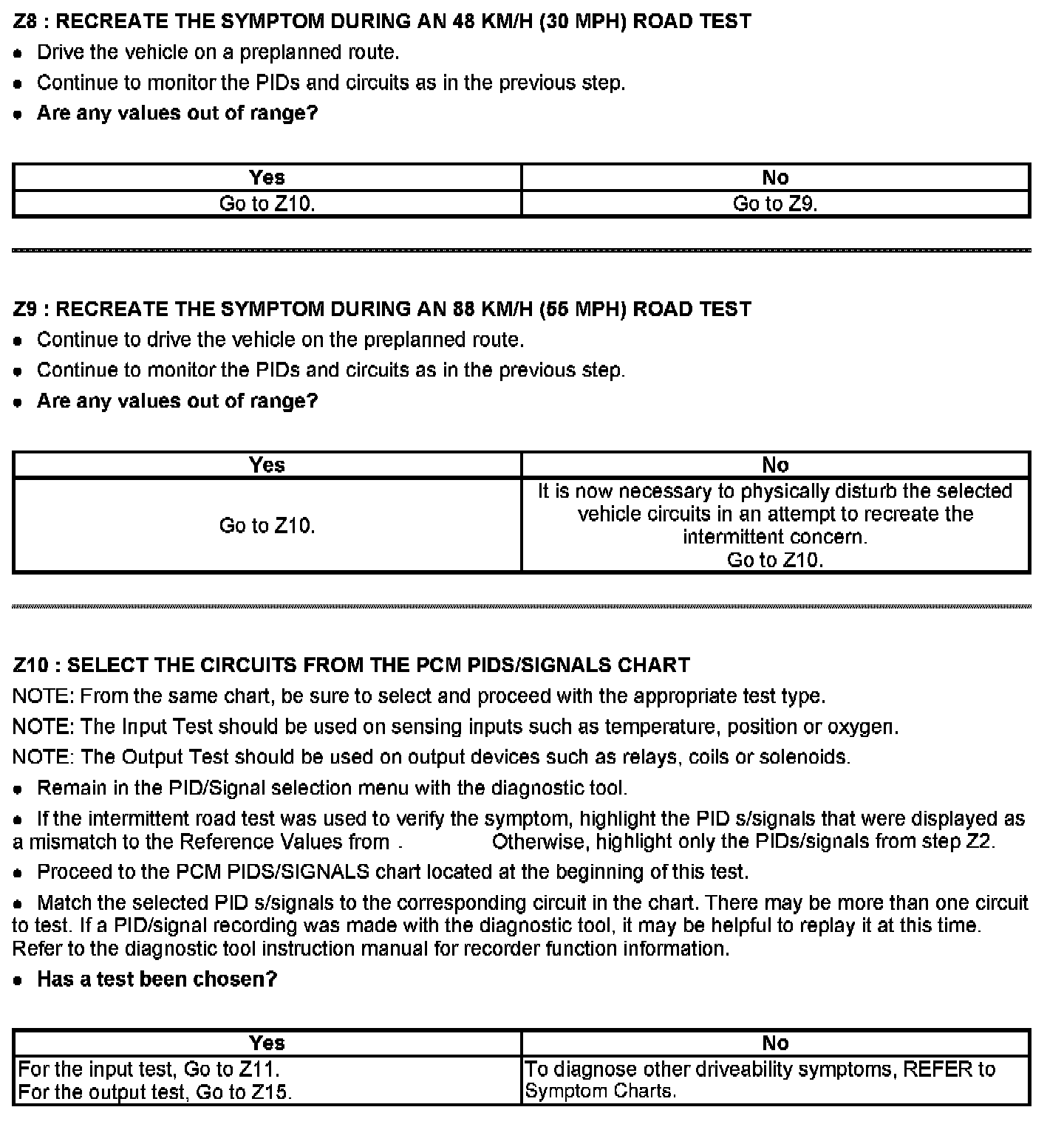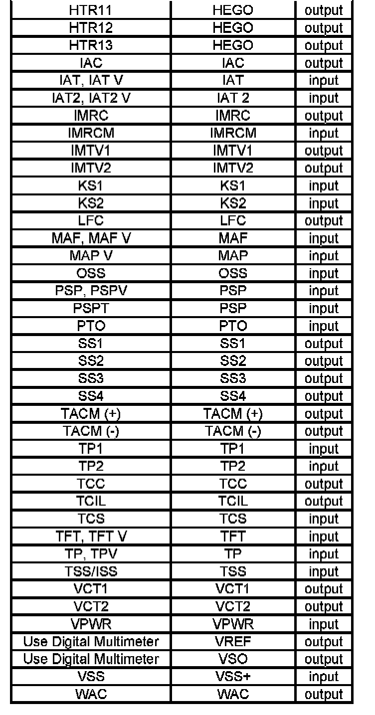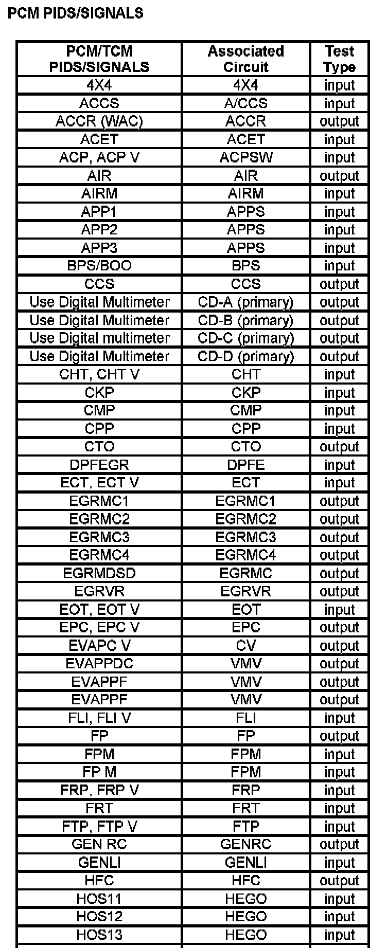 This chart is used to determine which test to run for the suspect circuit. PIDs corresponding to each circuit are listed. Some circuits do not have an associated PID or the PID may not be available and has to be measured with a digital multimeter (DMM). If the vehicle has a coil pack system with a no start condition carry out the ignition test.