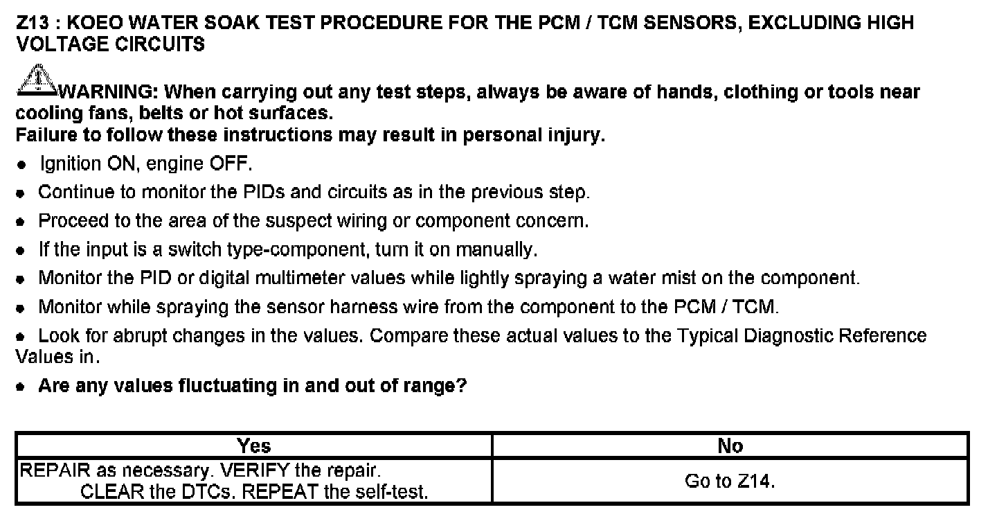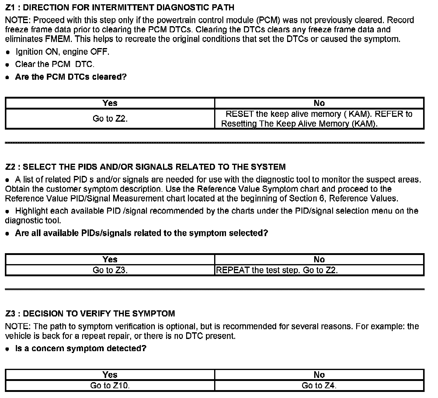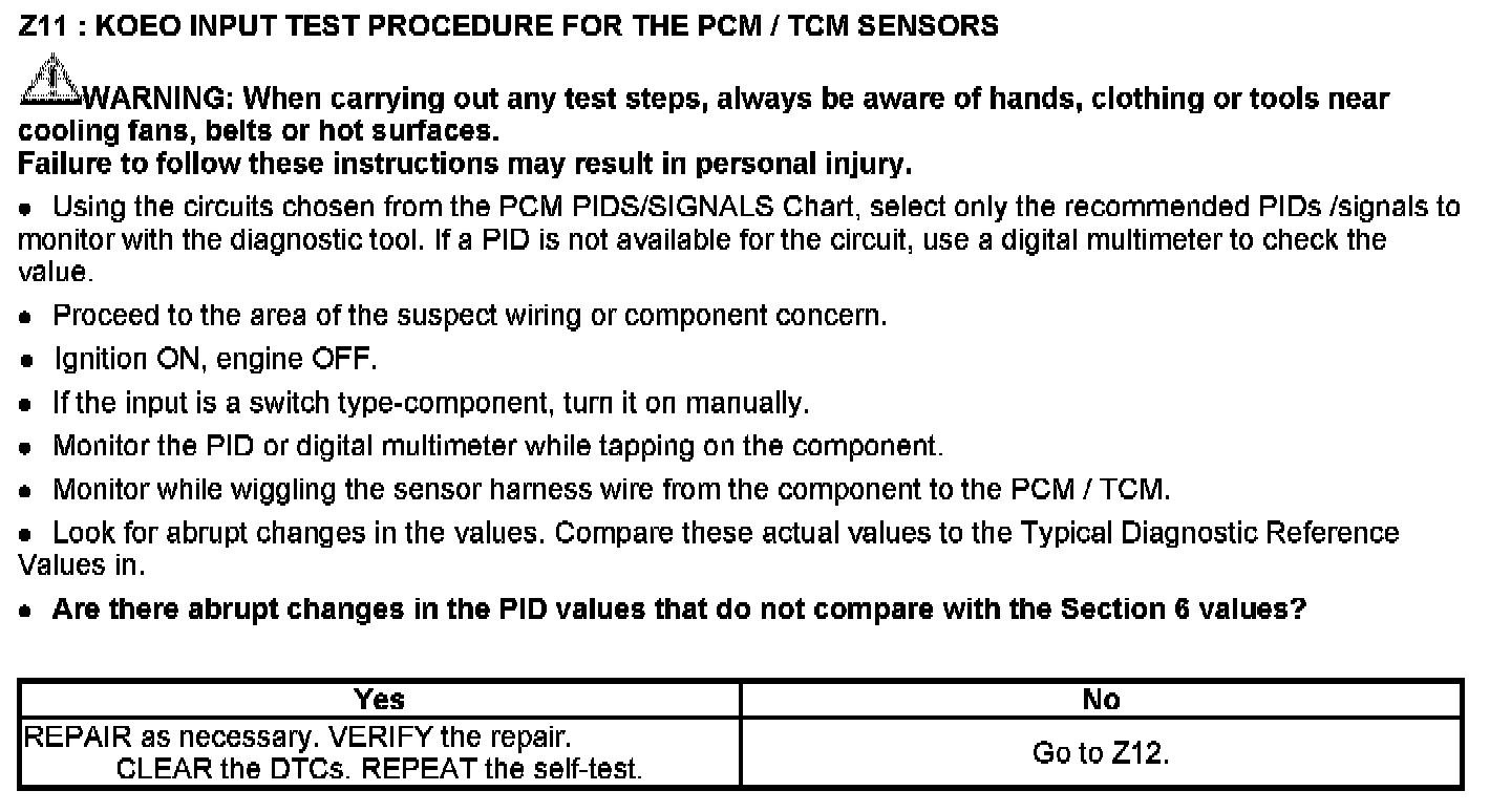 This chart is used to determine which test to run for the suspect circuit. PIDs corresponding to each circuit are listed. Some circuits do not have an associated PID or the PID may not be available and has to be measured with a digital multimeter (DMM). If the vehicle has a coil pack system with a no start condition carry out the ignition test.