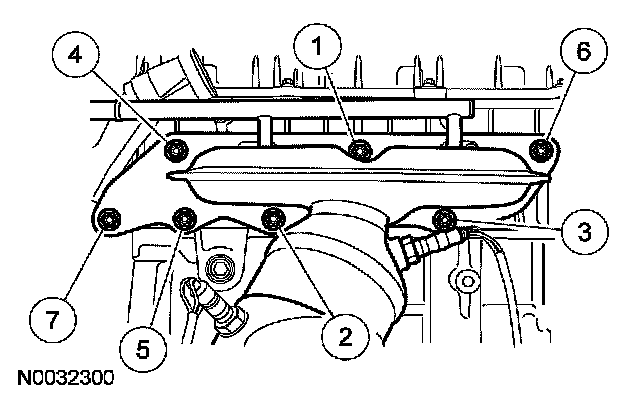 Tighten the 7 new catalytic converter-to-cylinder head nuts and studs to 55 Nm (41 ft. lbs.) in the sequence shown.