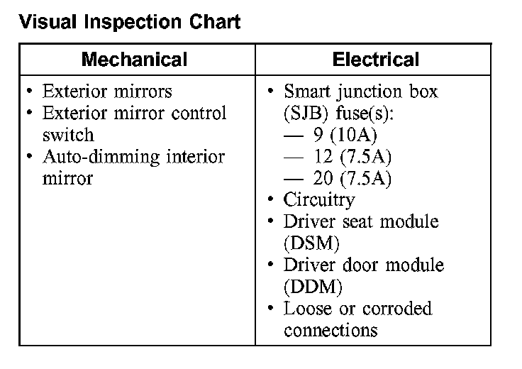 2. Inspect the components of the exterior mirror system to determine if any of the mechanical or electrical concerns apply:
