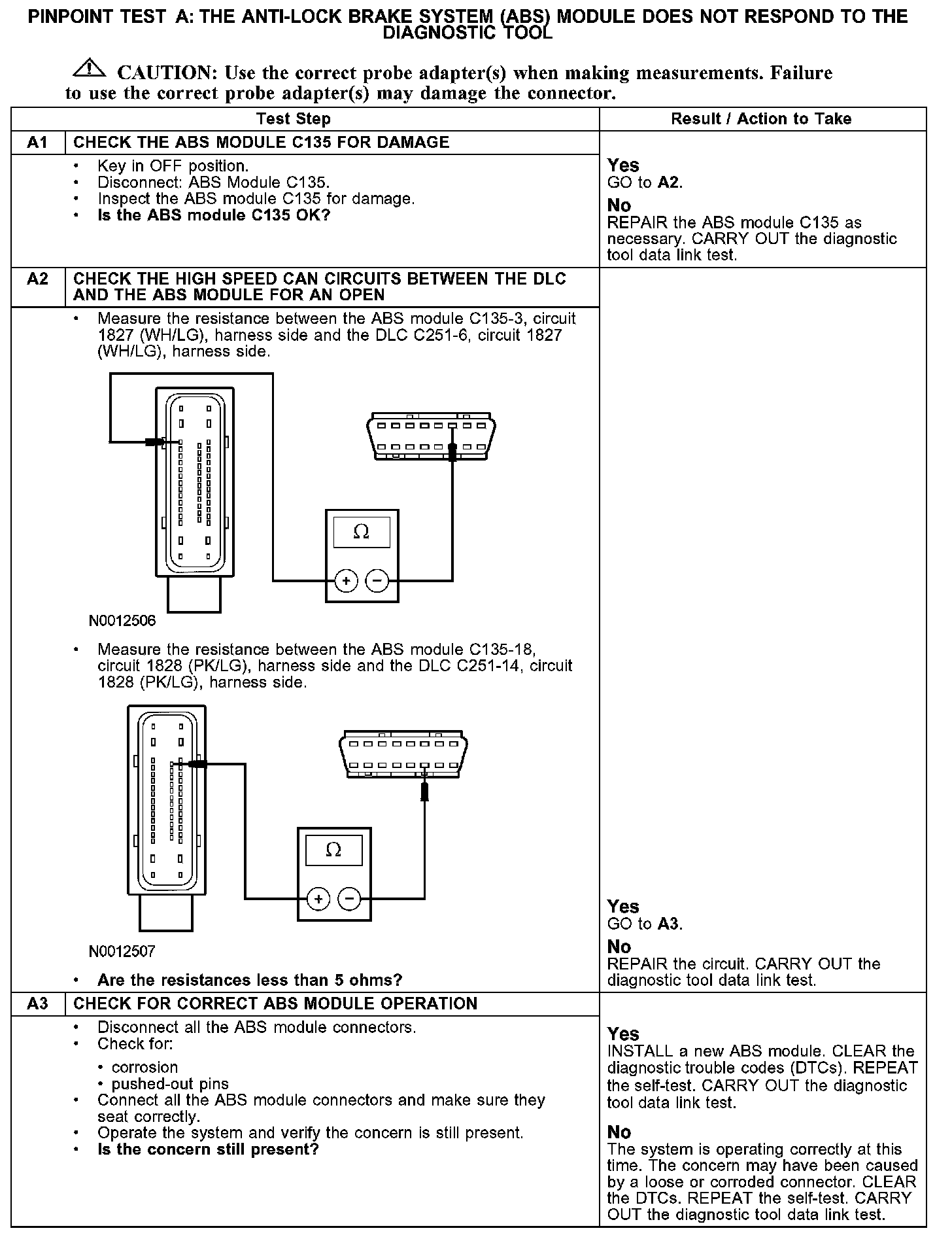 The ABS module communicates with the diagnostic tool through the high speed controller area network (CAN), circuits 1827 (WH/LG) and 1828 (PK/LG). Check circuits 1827 (WH/LG) and 1828 (PK/LG) between the ABS module C135 and the data link connector (DLC) C251.The total resistance values must not be more than 5 ohms. If the resistance is more than 5 ohms there is an open in one of the high speed CAN circuits, damage to the DLC C251, damage to the ABS module C135, or damage to an in-line connector.