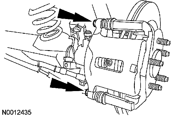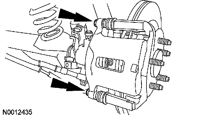 13. Position the brake caliper and install the 2 brake caliper bolts.