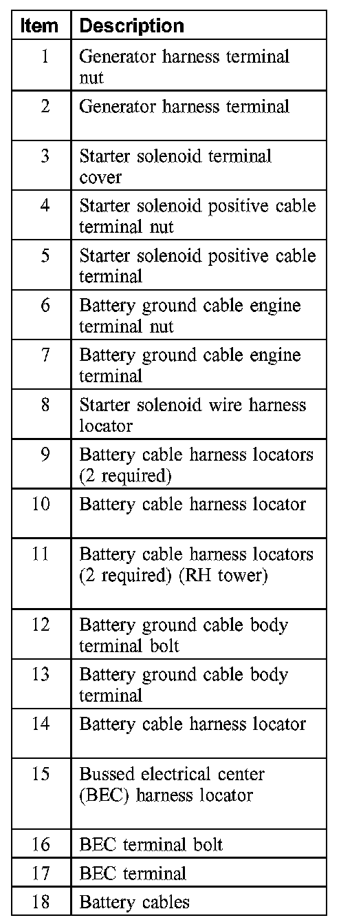 10. Remove the 2 battery cable harness locators from the RH strut tower.